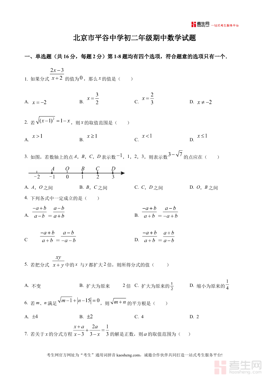 《精品解析:北京市平谷中学2025-2026学年八年级上学期期中数学试题(原卷版)》是针对北京市平谷中学2025-2026学年八年级学生上学期期中考试的数学学科备考资料,紧密贴合该学年该阶段的教学进度与考试要求,为学生提供与实际考试场景一致的试题呈现形式。