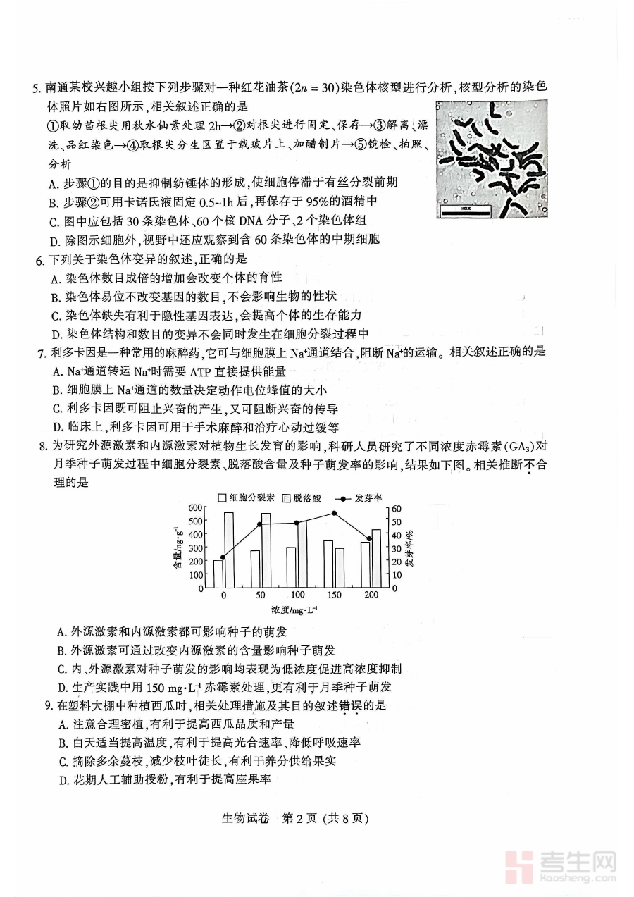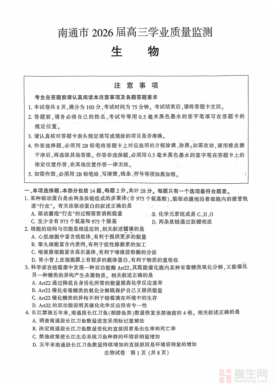该试题的适用人群主要为江苏省南通市2026届高三学生及相关生物学科教师。对于学生而言,完成这份试题能有效检验阶段性学习成果,助力查漏补缺;对于教师而言,试题的监测数据可支撑更科学的教学规划与备考指导,提升教学的针对性和有效性,共同推动高三生物学科教学质量的提升。