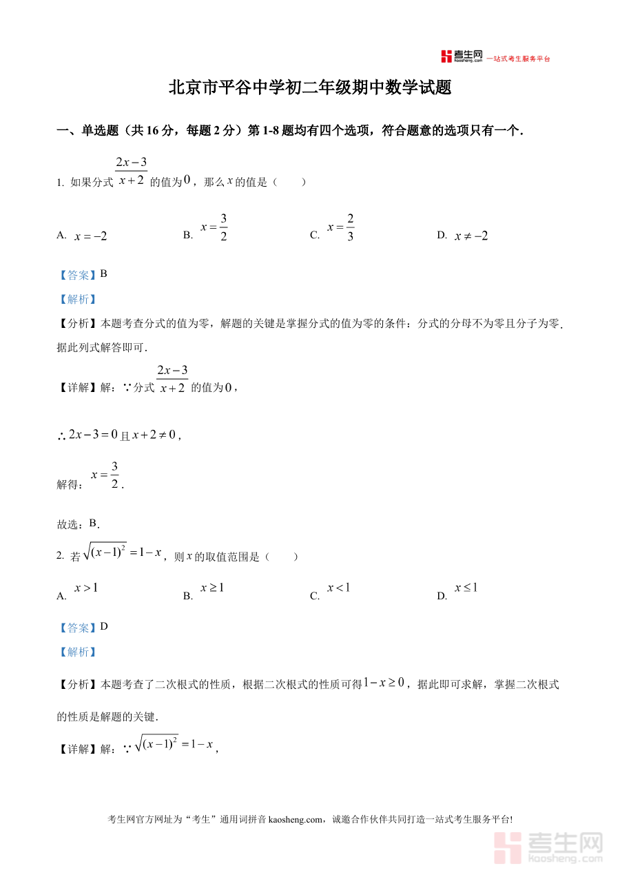 《精品解析:北京市平谷中学2025-2026学年八年级上学期期中数学试题(解析版)》是面向北京市平谷中学2025至2026学年八年级学生的期中数学考试配套解析资料,精准对应该学年上学期期中阶段的数学学业检测场景,为师生提供与学校期中考试紧密相关的专业参考内容,聚焦期中阶段数学学习成果的检验与分析需求。
