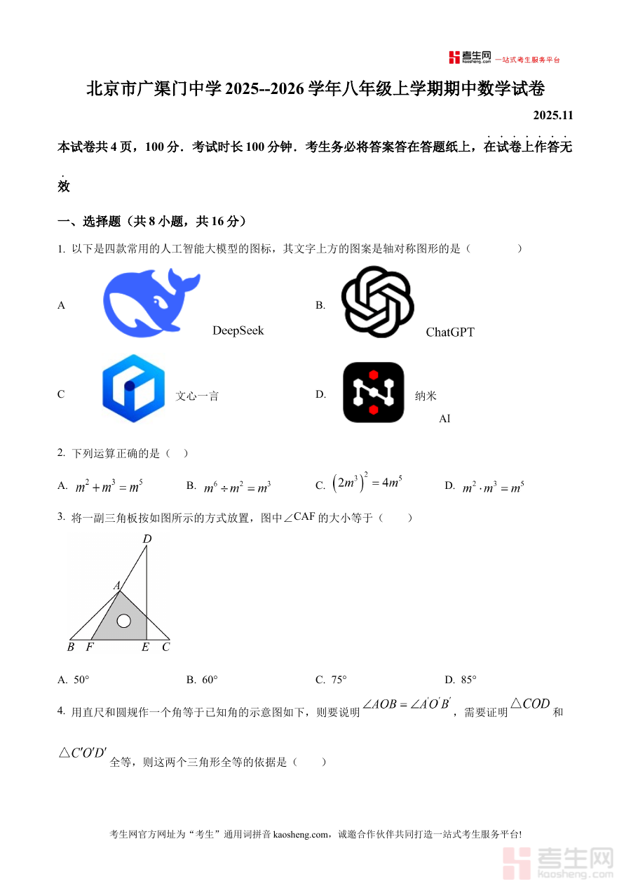 《精品解析:北京市广渠门中学2025--2026学年八年级上学期期中数学试卷(原卷版)》是针对北京市广渠门中学2025至2026学年八年级上学期期中数学考试的配套备考资料,聚焦该阶段数学学科的期中检测需求,为使用者提供贴合学校教学进度与考试要求的原始试卷内容。