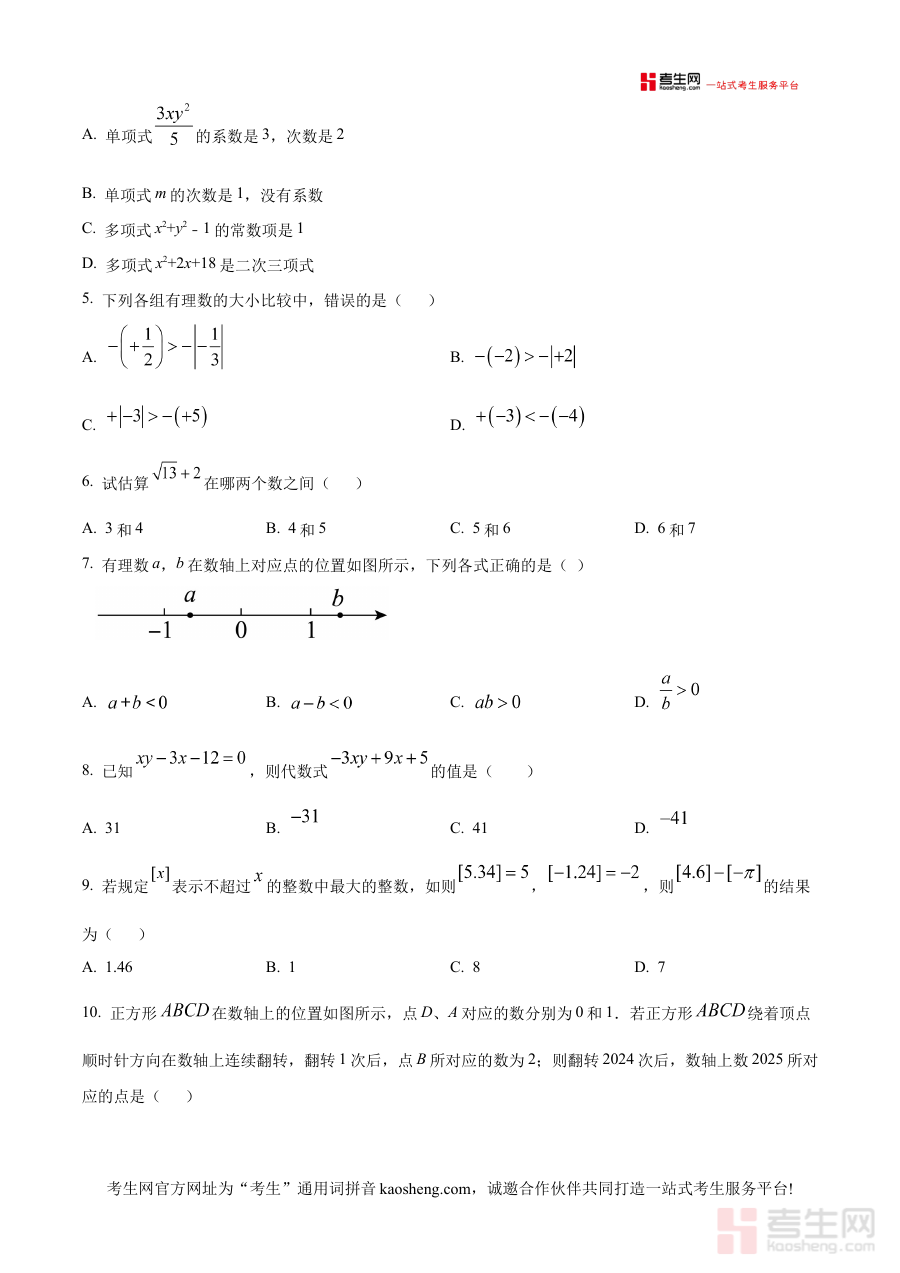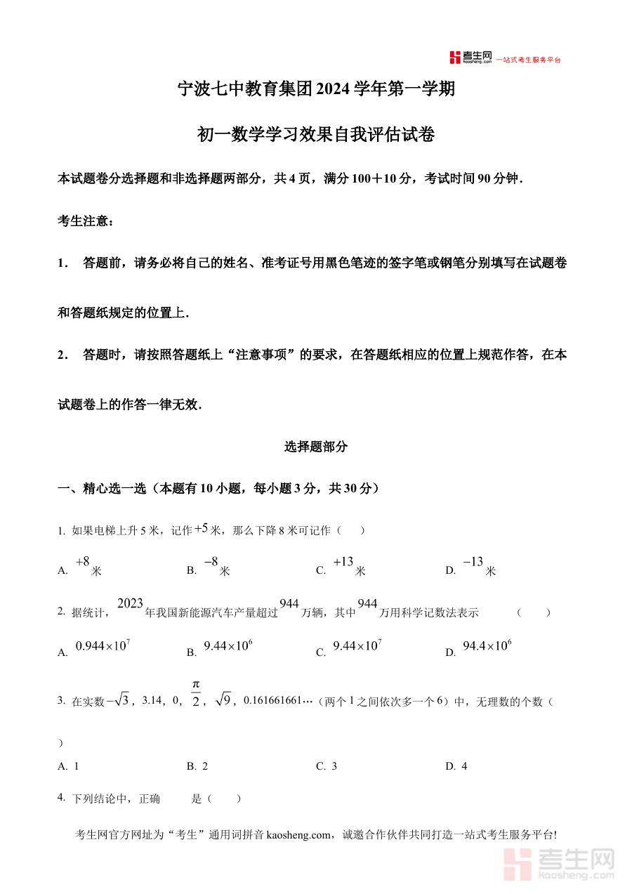 《精品解析:浙江省宁波七中教育集团2024—2025学年上学期七年级数学期中试题(原卷版)》是针对浙江省宁波七中教育集团2024至2025学年第一学期七年级数学期中考试的备考资料,聚焦该阶段数学学科的期中检测需求,为使用者提供与实际考试题型、结构相匹配的原卷内容参考。