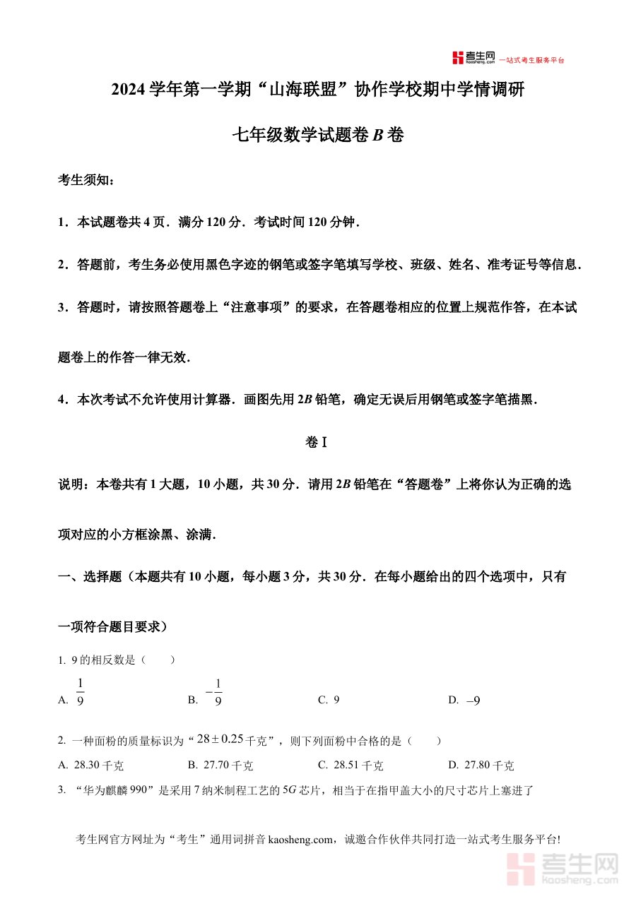 《精品解析:浙江省宁波市“山海联盟”协作学校2024-2025学年上学期期中学情调研七年级数学试题(B卷)(原卷版)》是针对2024-2025学年上学期浙江省宁波市“山海联盟”协作学校七年级数学期中学情调研B卷的备考资料,聚焦该阶段数学学科的期中学情检测需求,为使用者提供与实际调研考试匹配的原卷内容参考。