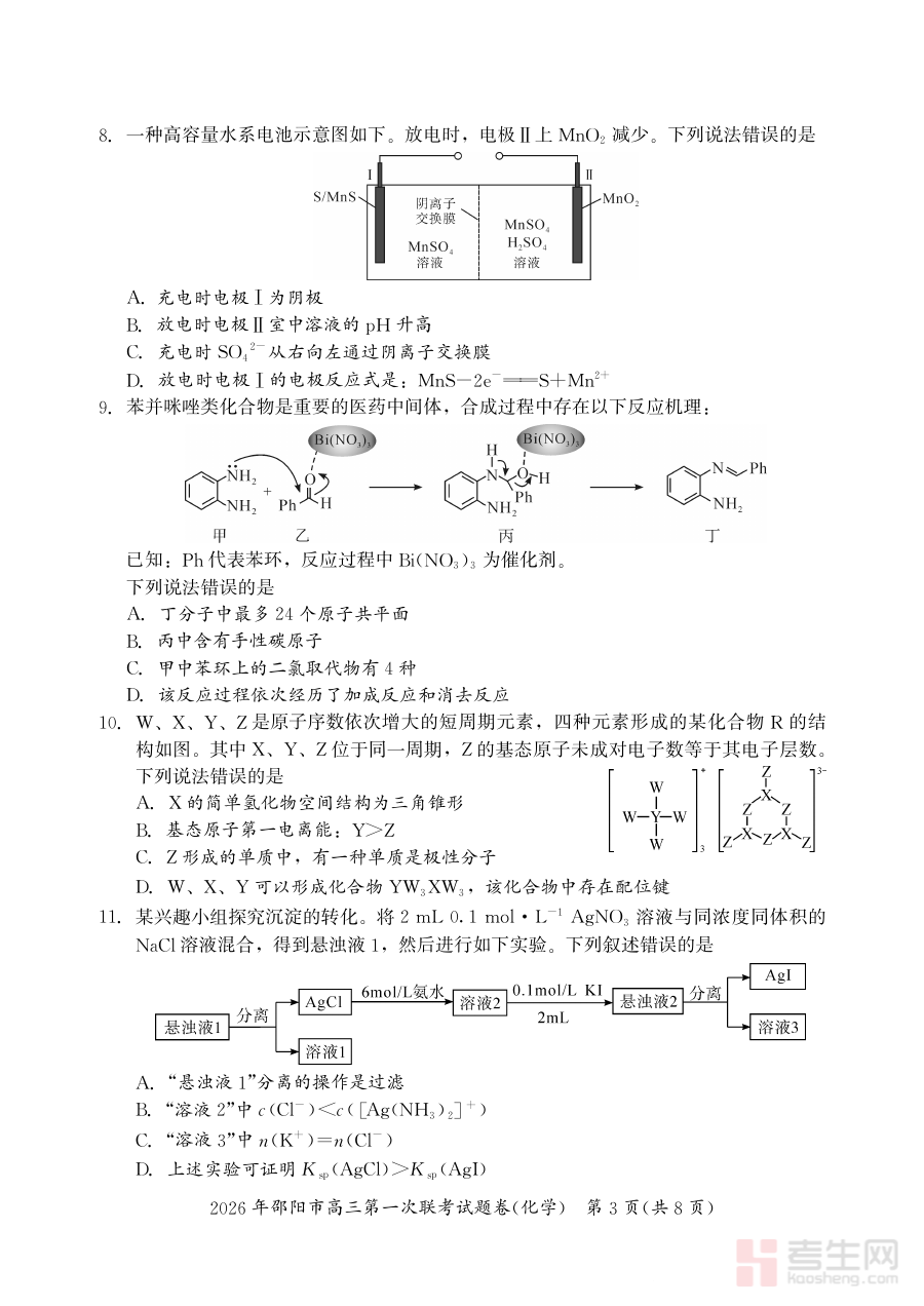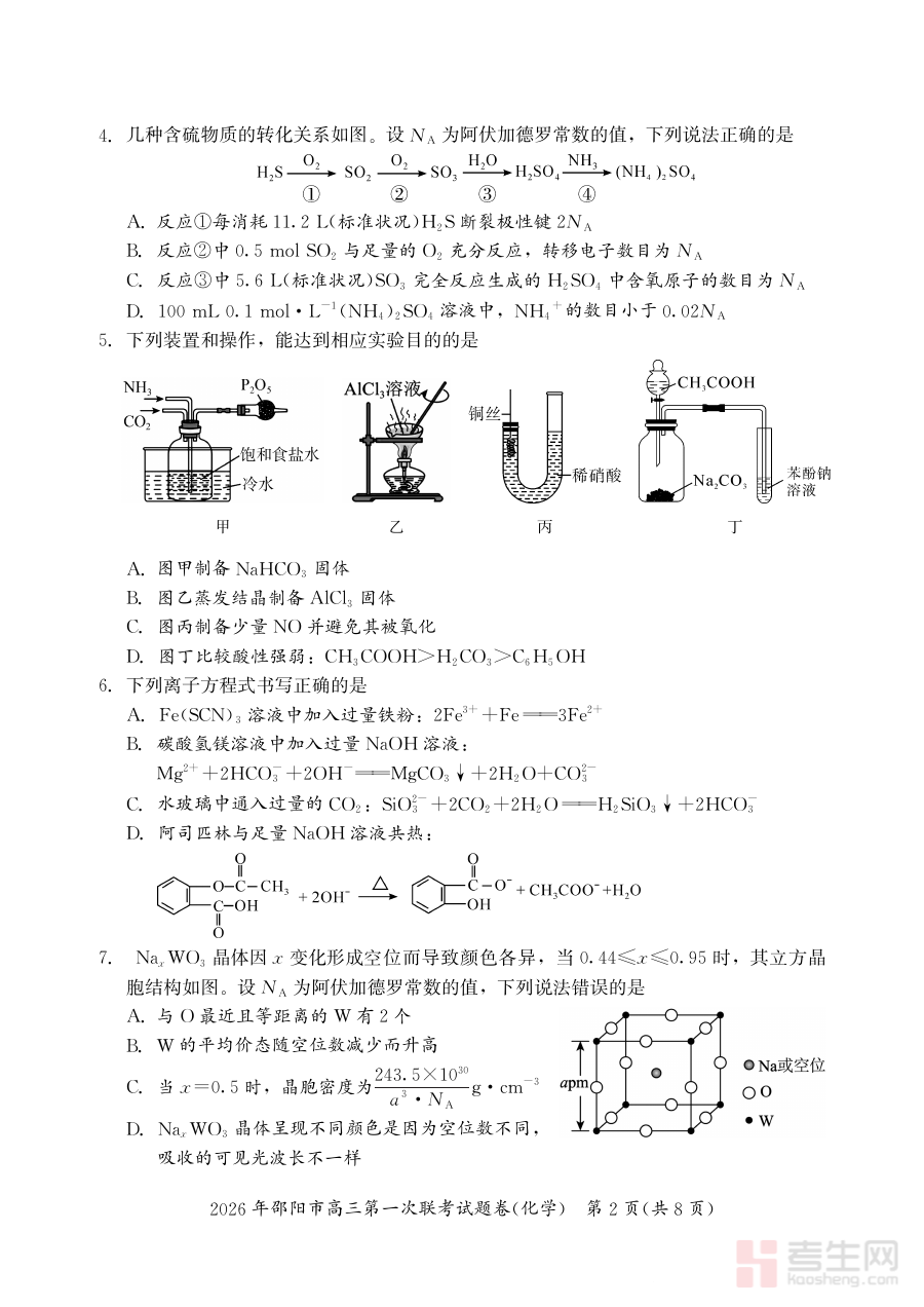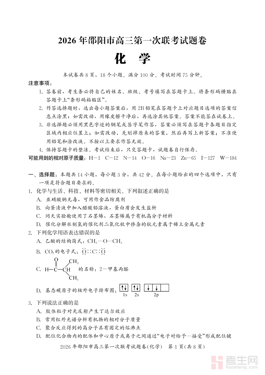 《2026年邵阳市高三第一次联考化学试题》是2026年邵阳市面向本地高三学生组织的首次联合考试中的化学学科测试材料。该试题紧密结合高三化学阶段性学习目标与区域教学实际,是高三学生进入系统备考阶段初期的关键备考资源,能够反映本地高三化学教学的阶段性要求与考查方向。