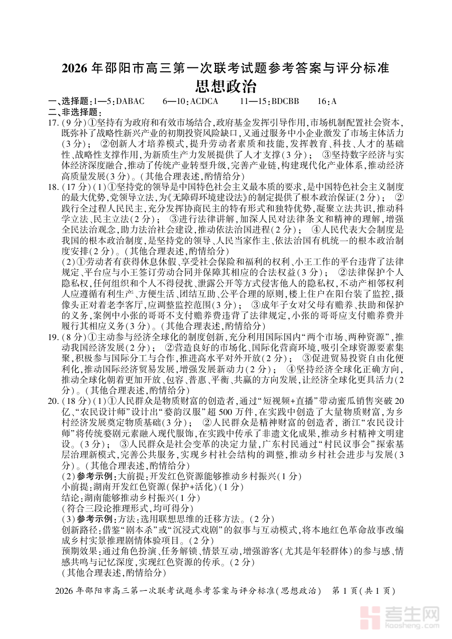 《2026年邵阳市高三第一次联考政治试题参考答案及评分标准》是针对2026年邵阳市高三年级首次区域性联考政治科目的官方配套资料,包含试题的完整参考答案与详细评分细则两部分核心内容。作为高三阶段初期的重要参考材料,它紧密衔接邵阳市高三政治教学进度与联考命题要求,为考生和教师提供了权威且规范的作答与评价依据。