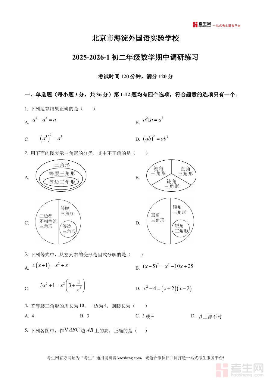 《精品解析:北京市海淀外国语实验学校2025-2026学年八年级上学期期中考试数学试卷(原卷版)》是针对北京市海淀外国语实验学校2025-2026学年八年级学生上学期期中考试的数学学科原卷类备考资料,精准贴合该校该学年该阶段数学考试的形式与要求,为学生提供与实际考试一致的练习载体。