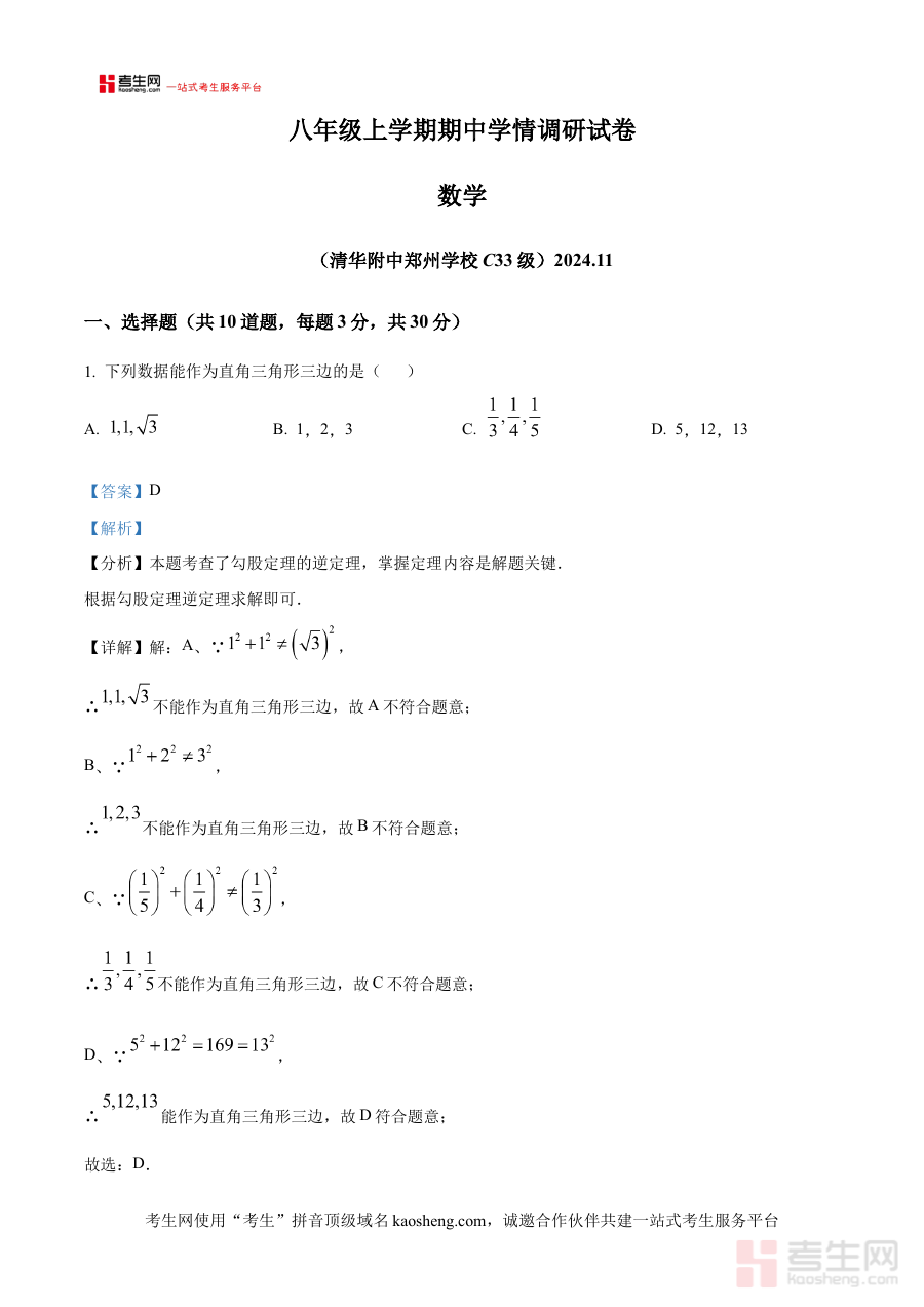 本资料主要适用于河南省郑州市清华附中郑州学校2024-2025学年八年级学生,同时可为同年级、同地区有相似期中数学备考需求的学生提供参考,其解析内容有助于强化阶段检测应对能力与备考效率,助力学生提升期中数学考试表现。