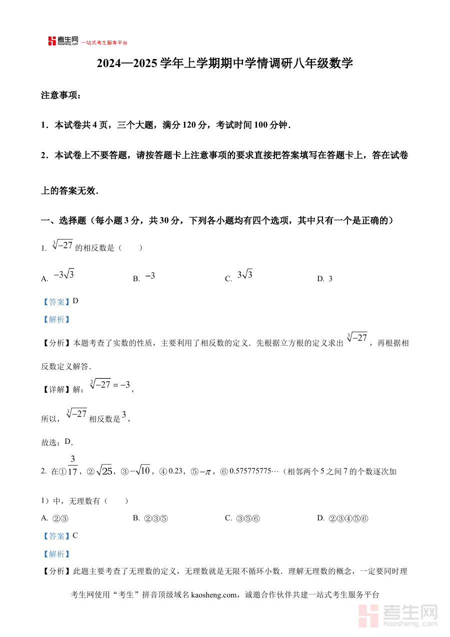 本资料主要适用于河南省郑州市登封嵩阳中学2024—2025学年八年级学生,同时也可作为教师开展教学评估、家长辅导孩子的参考材料,通过对期中试卷的专业解析,帮助使用者高效进行阶段检测复盘,完善备考规划,为后续数学学科的学习积累实用经验。