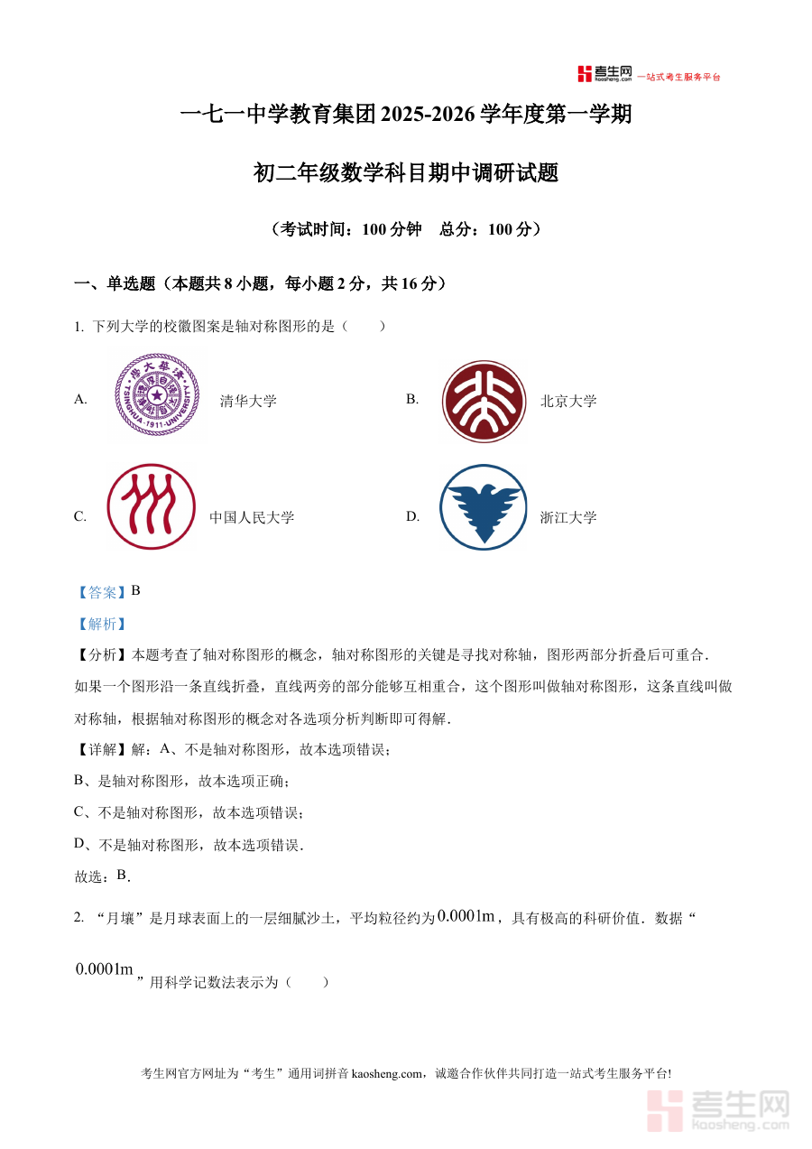 《精品解析:北京市第一七一中学2025--2026学年八年级上学期期中数学试卷(解析版)》是针对北京市第一七一中学2025至2026学年八年级上学期期中数学考试的专业备考资料,精准匹配该阶段数学学科的期中检测场景,为相关使用者提供系统的解析支持。