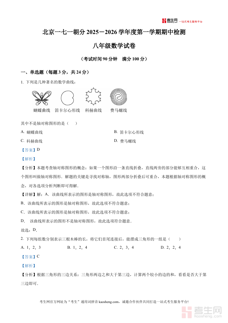 《精品解析:北京市第一七一中学朝阳豆各庄分校2025--2026学年八年级上学期期中数学试卷(解析版)》是针对北京市朝阳区特定中学的八年级上学期期中数学考试所编制的配套解析资料,聚焦2025至2026学年这一学年段的阶段性数学学习成果检测需求。作为经过精心整理的解析版本,它不仅对应该次期中考试试卷提供系统分析,更旨在为使用者提供全面的考试指导,帮助其准确把握该阶段数学考试的核心方向与考查重点,是适配该特定时间节点与学校的针对性备考资料。