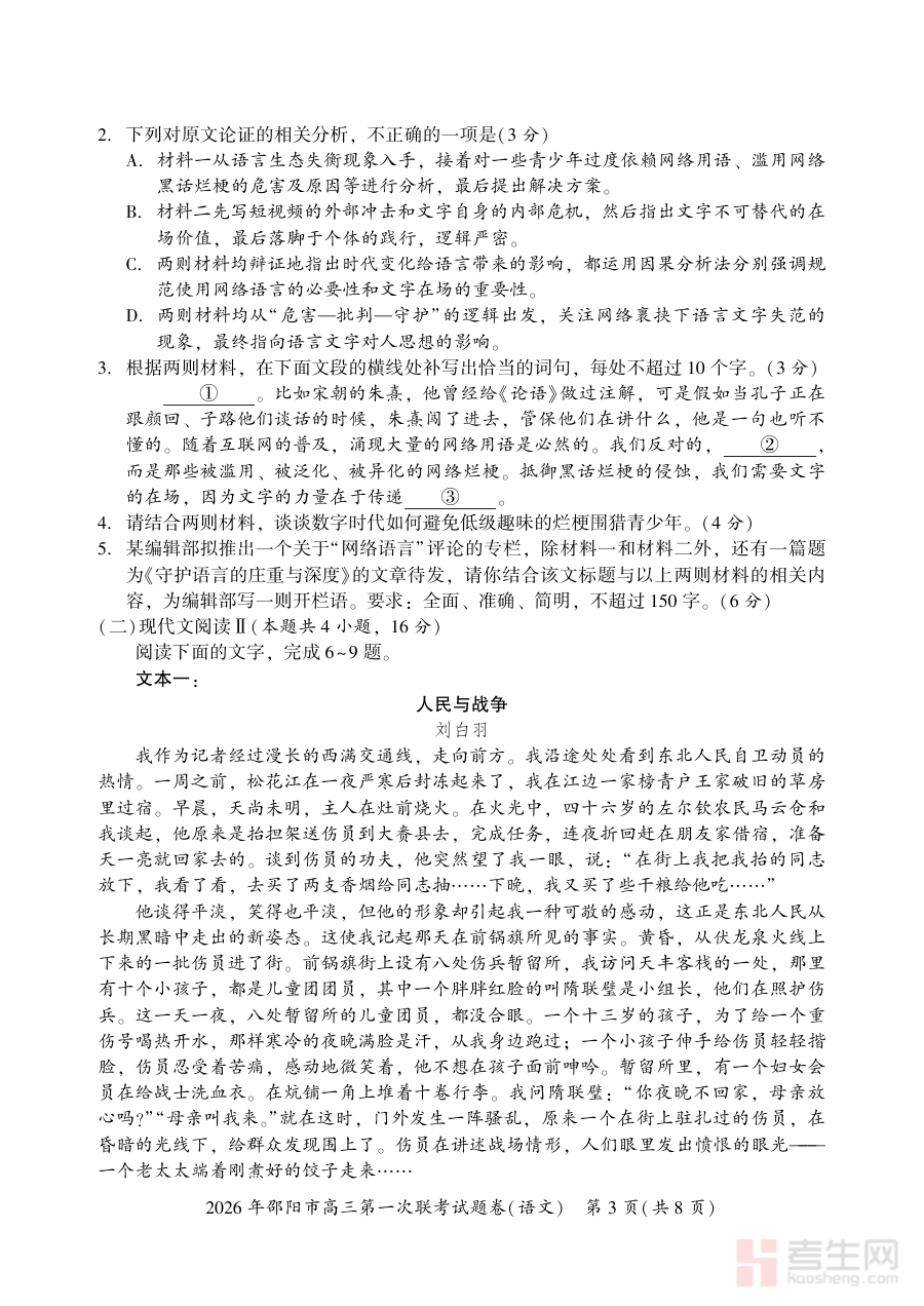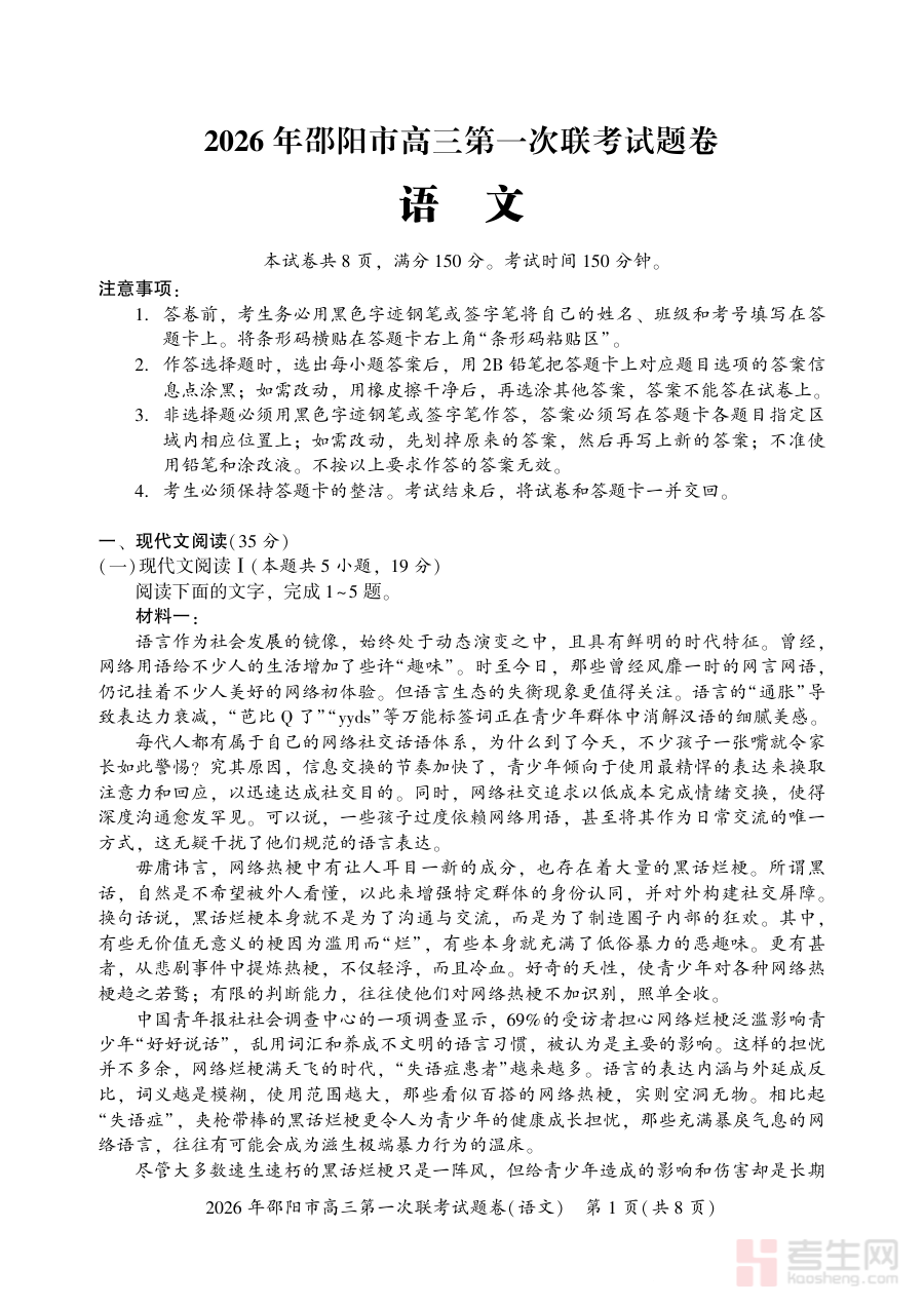 《2026年邵阳市高三第一次联考语文试题》是2026年度邵阳市针对当地高三学生组织的首次联合考试的语文科目测试材料,属于区域性高三学年早期的重要标准化考试资源。作为高三阶段进入系统备考前的关键检测工具,该试题紧密贴合邵阳市高三语文教学大纲要求与年度备考方向,为后续教学进度调整和学生个性化备考提供核心参考依据。
