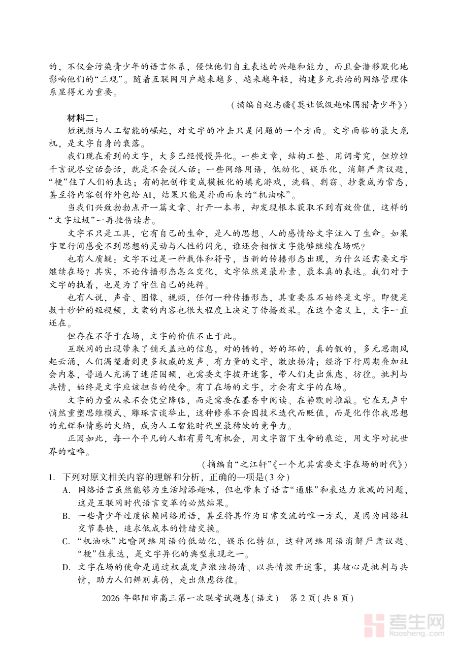 该试题适用于邵阳市及参与此次联考的周边区域高三学生群体,以及承担高三语文教学任务的教师。对于学生而言,完成这份试题可有效检测自身语文学习的阶段水平,及时发现薄弱环节并调整复习节奏,为后续系统复习和能力提升筑牢基础;对于教师而言,借助试题反馈的学情数据能更精准地制定分层教学方案,提升备考指导的针对性和有效性,推动整体备考质量的提升。
