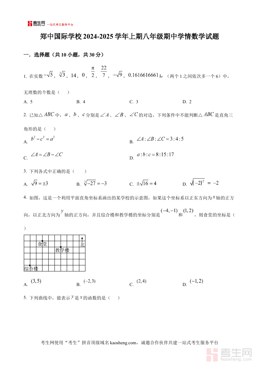 此资料主要适用于河南省郑州市郑中国际学校八年级学生群体,也可供该校数学教师作为教学参考或检测工具;通过使用该原卷版试卷,学生可提前熟悉期中考试的考查形式,定位知识薄弱点以提升备考针对性;教师则可借助该试卷了解学生学习状态,优化教学与备考规划。