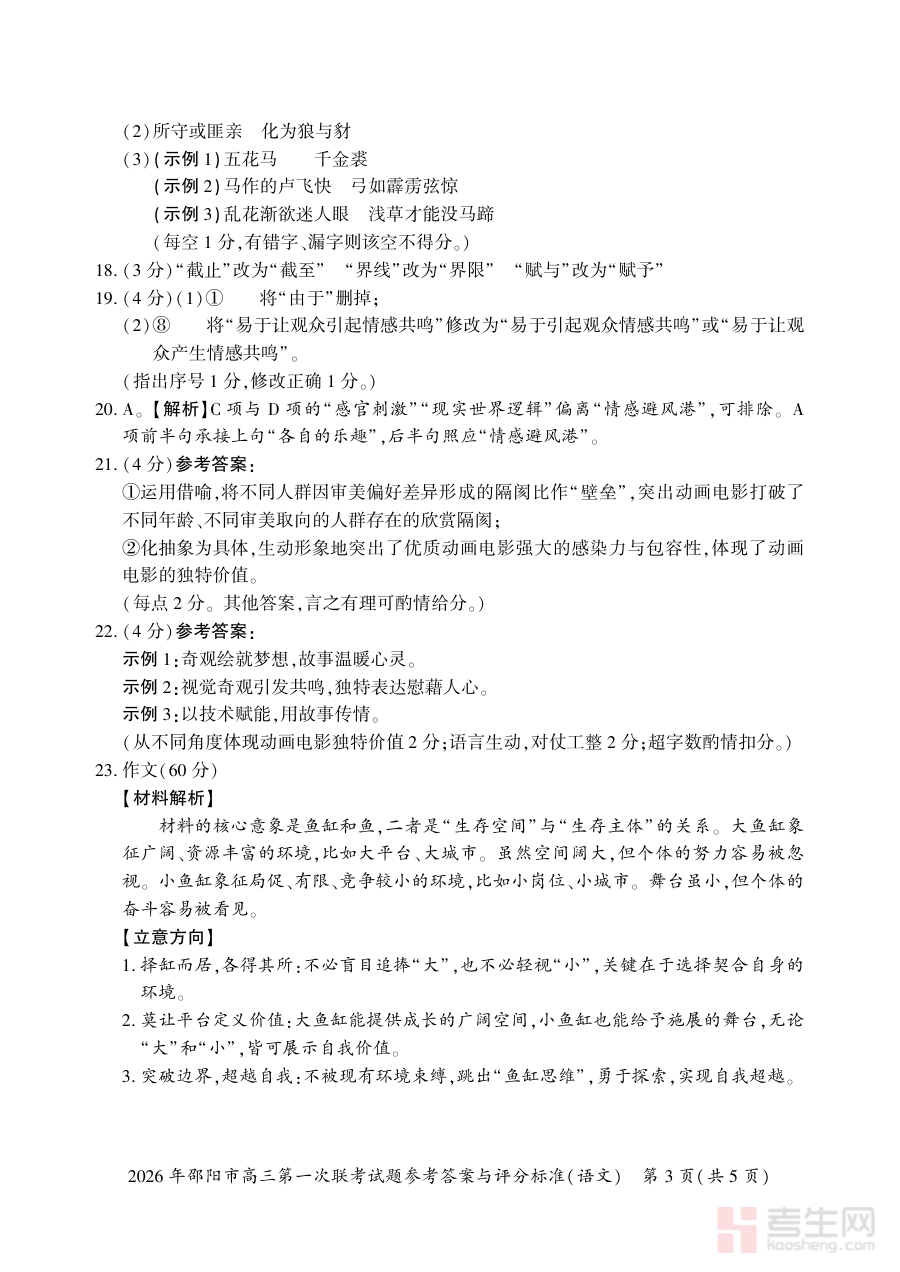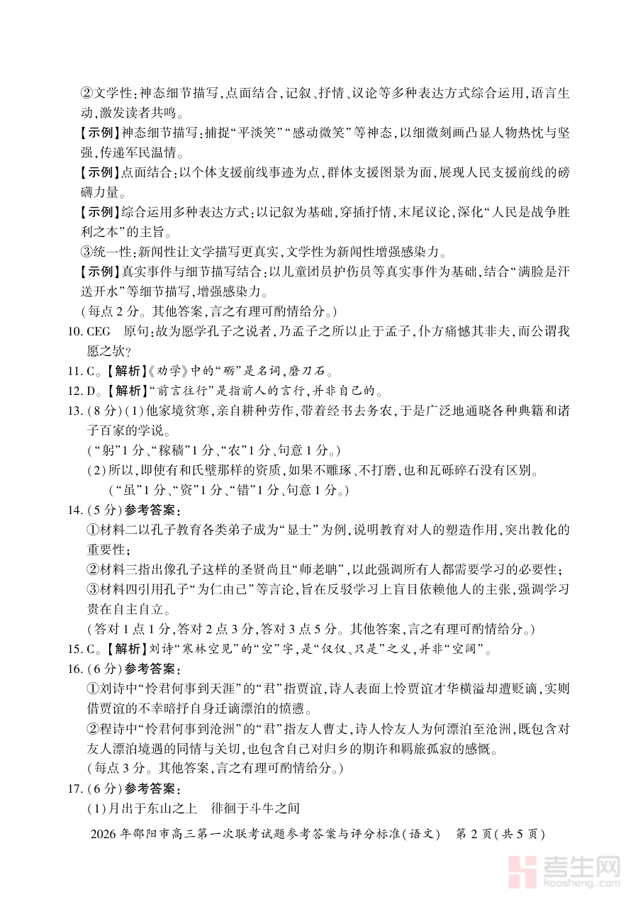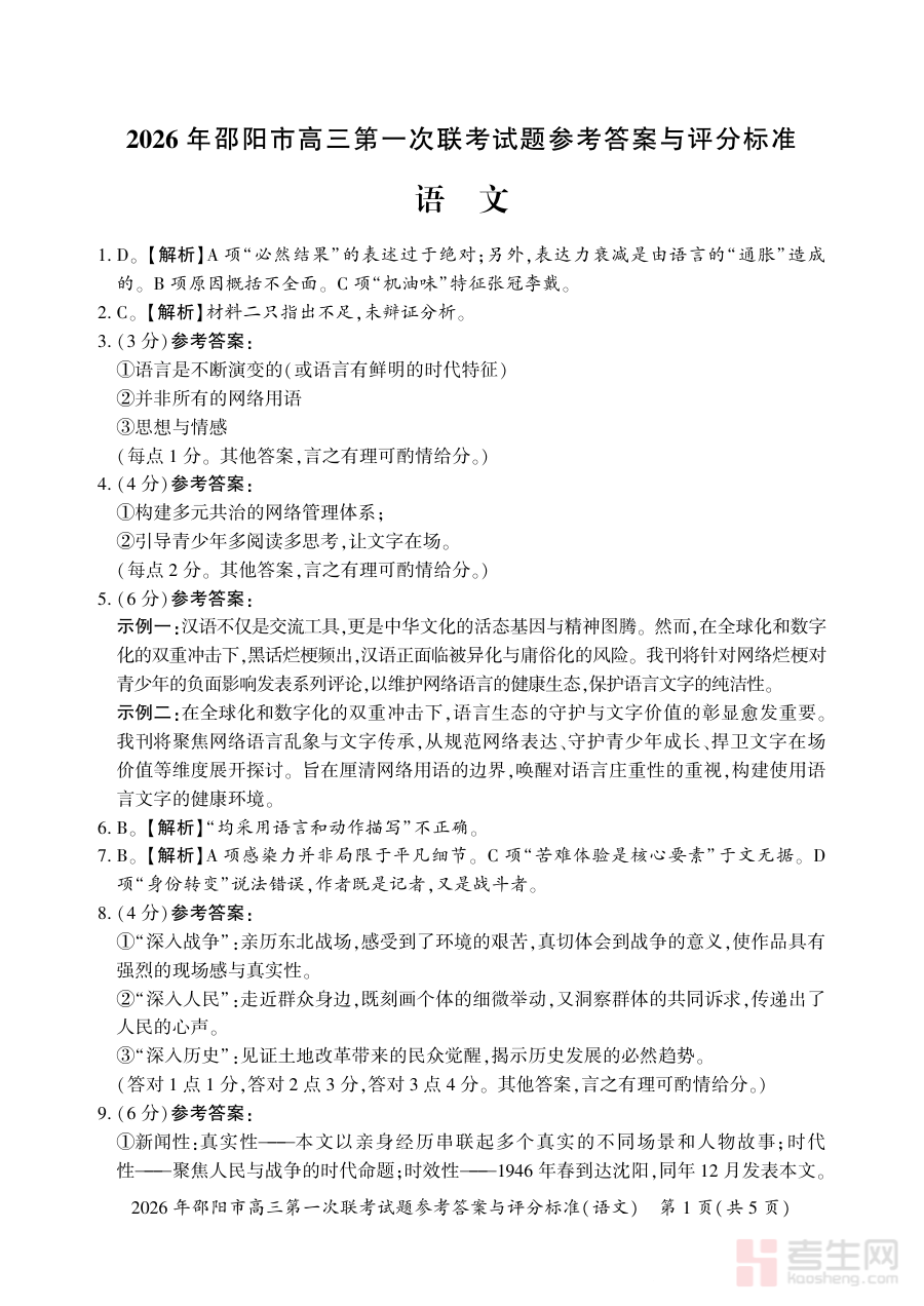 《2026年邵阳市高三第一次联考语文试题参考答案与评分标准》是2026年度邵阳市针对高三年级学生组织的第一次联合考试中,语文科目的官方配套资料。该资料包含本次联考语文试题的完整参考答案及详细评分标准两部分核心内容,是与联考试题紧密对应的重要辅助材料,旨在为考生和教学工作者提供明确的作答参考与评分依据,保障联考结果的公平性与科学性。