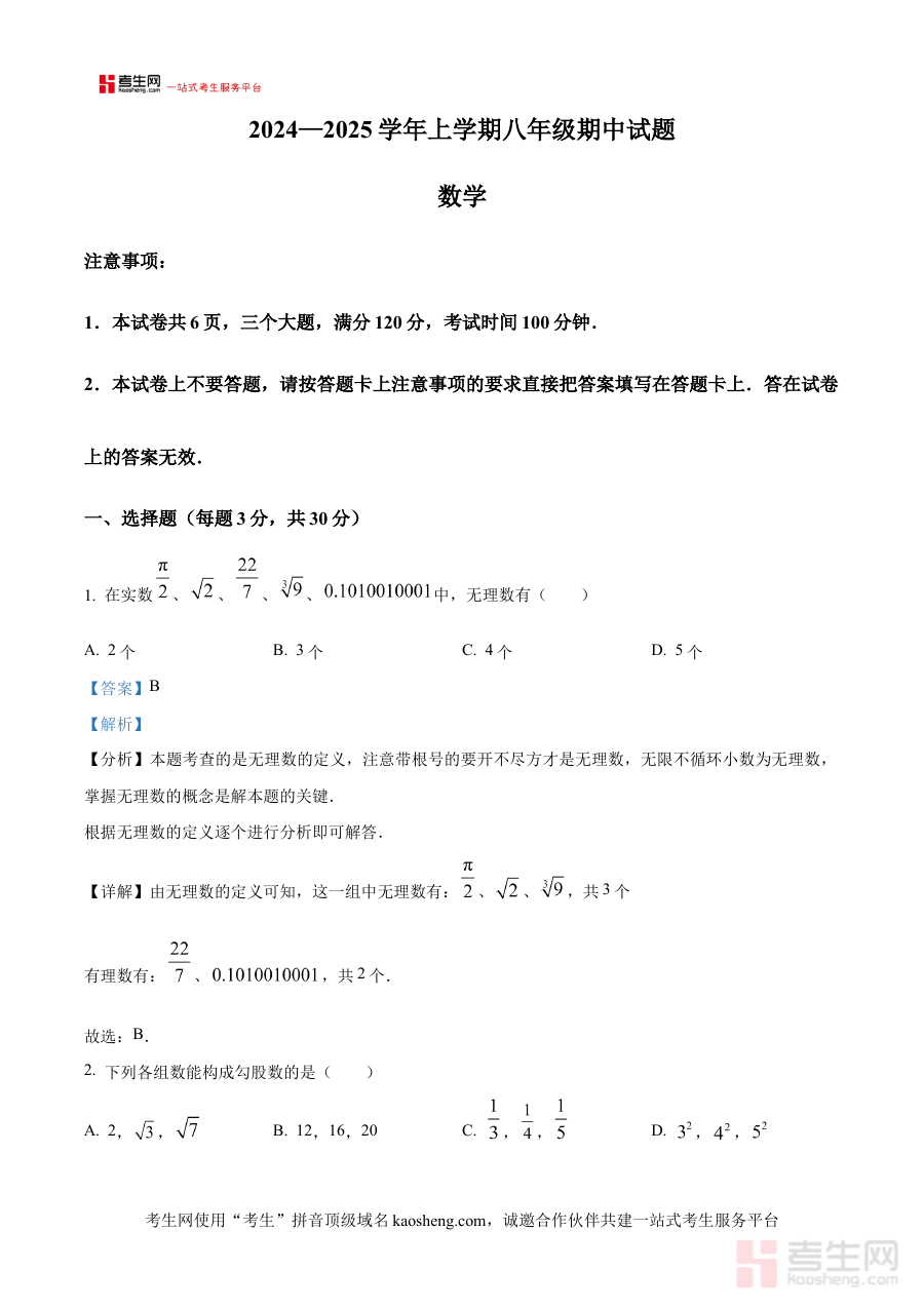 《精品解析:河南省郑州市金水区七校联考2024-2025学年八年级上学期11月期中数学试题(解析版)》是针对河南省郑州市金水区七所学校联合组织的2024-2025学年八年级上学期11月期中考试的数学学科备考资料。该资料结合区域联考的标准化考试属性,聚焦八年级上学期中期数学学习的阶段性检测需求,为使用者提供与本次考试内容精准匹配的专业解析支持。