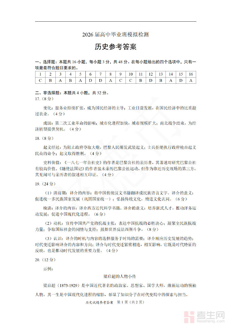《历史答案-福建省部分地市2026届高中毕业班第一次质量检测》是针对福建省部分地市2026届高中毕业生开展的第一次质量检测历史科目的配套答案资料。该检测属于高三阶段初期的综合性质量评估考试,旨在系统了解学生历史学科知识的掌握状况,为后续教学与备考工作提供客观依据。