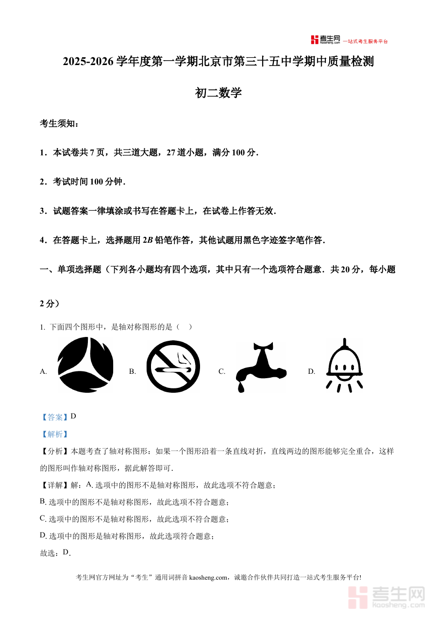 《精品解析:北京市第三十五中学2025-2026学年八年级上学期期中数学试题(解析版)》是针对北京市第三十五中学2025-2026学年八年级上学期期中数学考试的专项备考资料,精准贴合该学校该学年八年级上学期数学期中检测的具体场景与需求。
