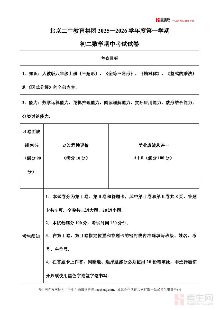 此资料适用于北京市第二中学教育集团2025-2026学年八年级学生及相关数学教师。对于学生而言,通过使用原卷版试卷进行模拟练习,可有效提升应试能力与时间管理能力;对于教师,则可借助其了解阶段教学效果,优化教学内容与方法,更好地支持学生的数学学习与备考进程。