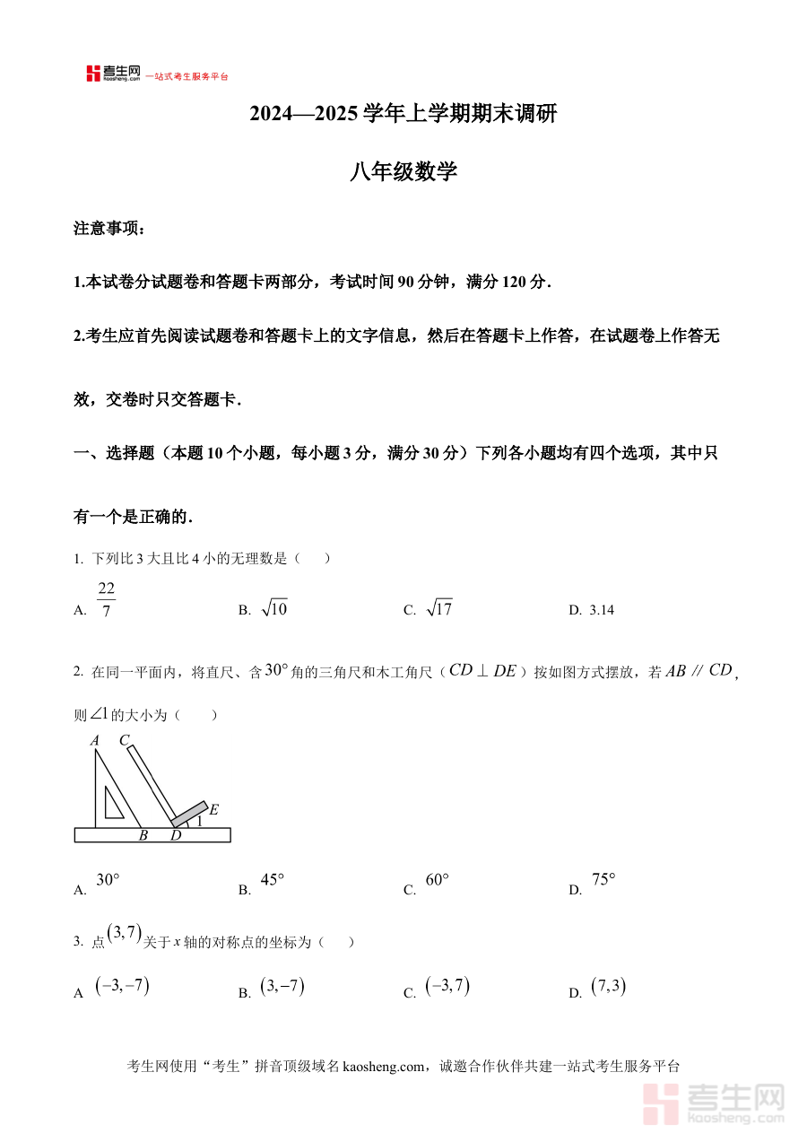 《精品解析:河南省郑州市高新区2024—2025学年上学期八年级期末数学试卷(原卷版)》是面向河南省郑州市高新区2024至2025学年上学期八年级期末数学考试的专用备考资料,精准对应该区域特定学段学期的数学期末测评场景,为相关学习与教学活动提供原卷形式的参考依据。