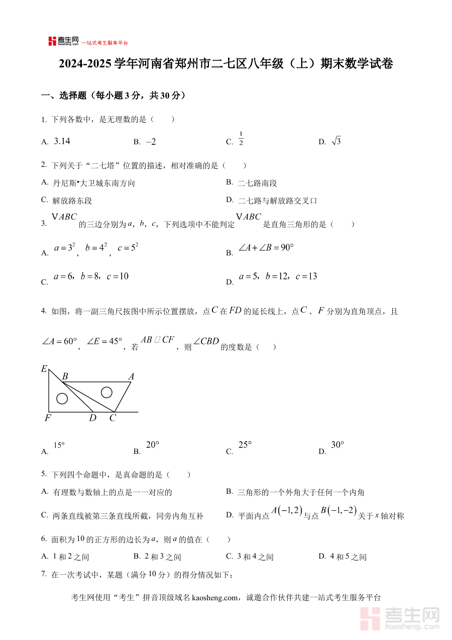 《精品解析:河南省郑州市二七区2024-2025学年八年级上学期期末考试数学试卷(原卷版)》是针对河南省郑州市二七区特定学年段与考试场景的数学学科备考资料,精准对应2024-2025学年八年级上学期期末考试的考查范围与形式,为相关群体提供贴合本地教学实际的备考支持。
