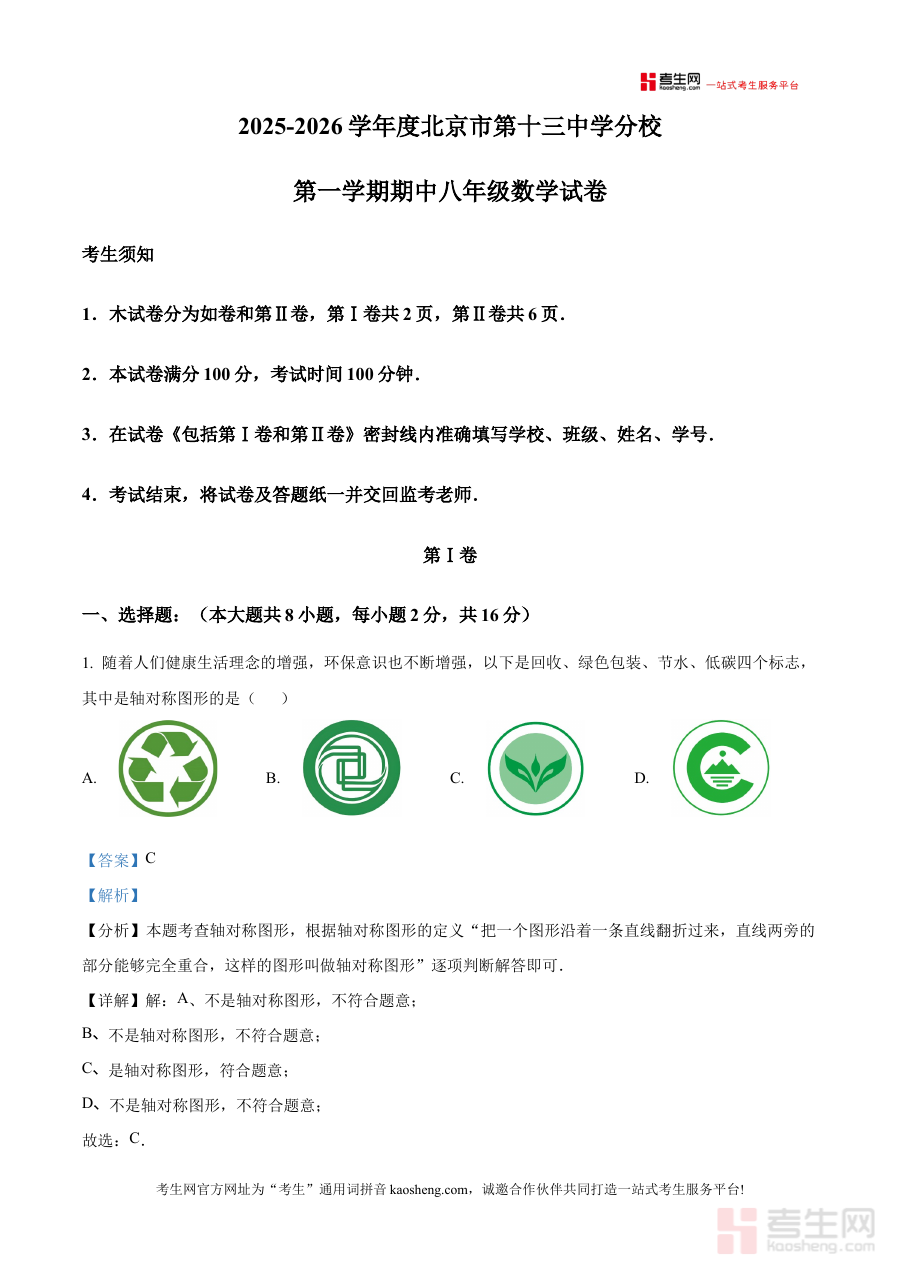 《精品解析:北京市第十三中学分校2025-2026学年八年级上学期期中考试数学试题(解析版)》是针对北京市第十三中学分校2025-2026学年八年级上学期数学期中考试的专业备考资料,聚焦该学段该学科的阶段性考查需求,为相关师生提供精准的试题解析支持。