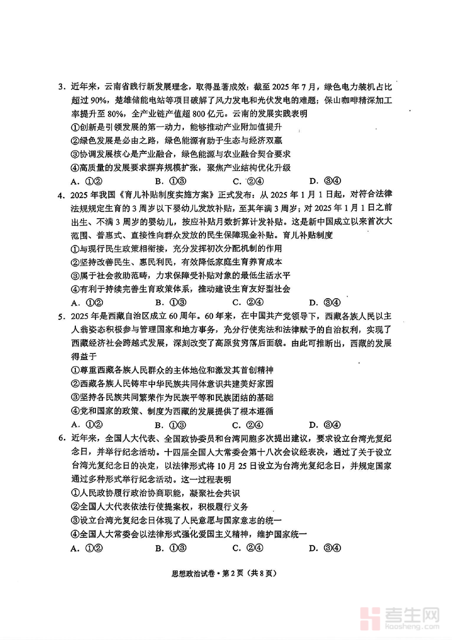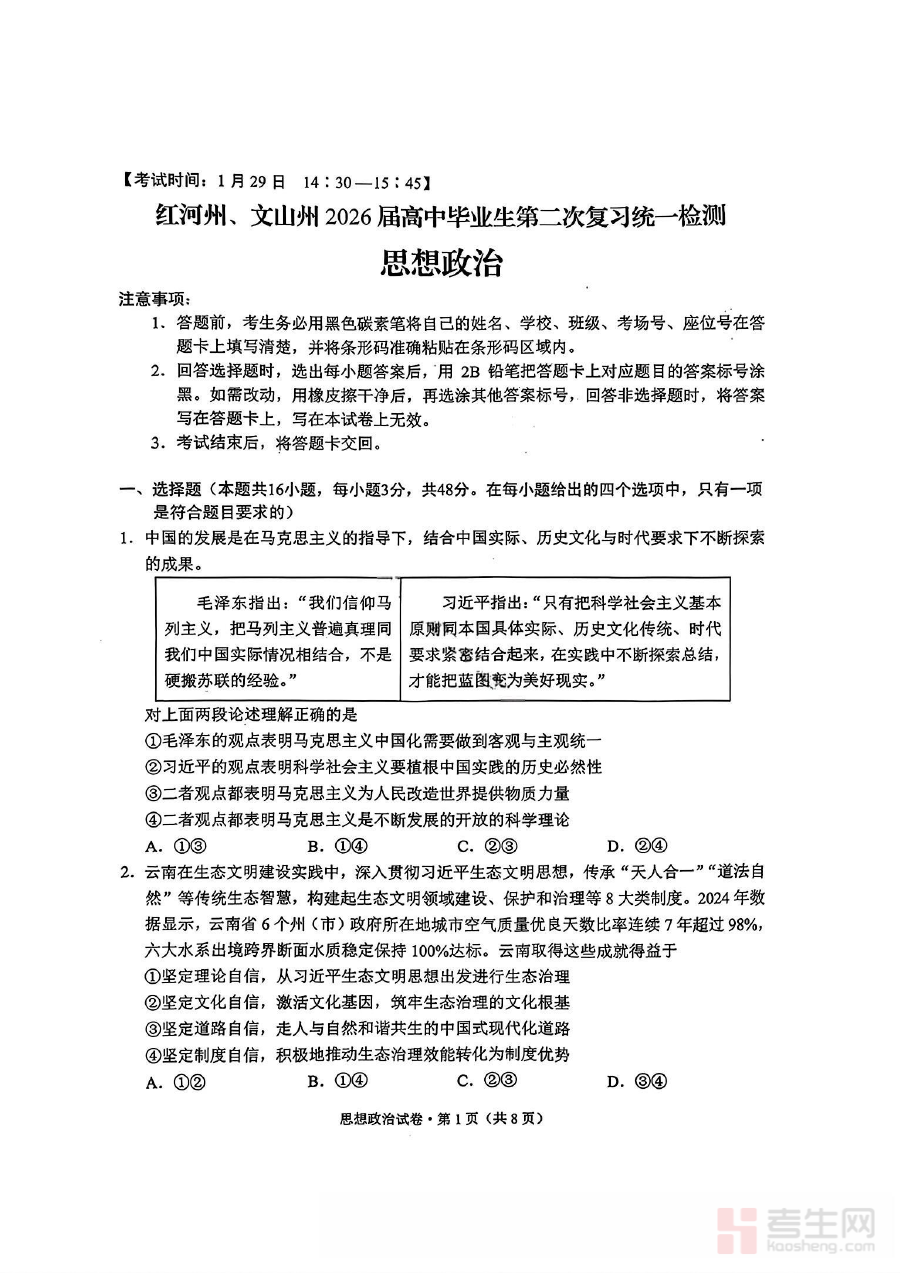 《红河州、文山州2026届高中毕业生第二次复习统一检测政治+答案》是面向2026届红河州与文山州高中毕业生推出的政治学科阶段性复习检测资料,由两州教育相关部门统一组织命题并配套答案解析,旨在为考生提供贴合本地复习进度与考试要求的练习资源,是考生进行阶段性复习效果验证的重要载体。