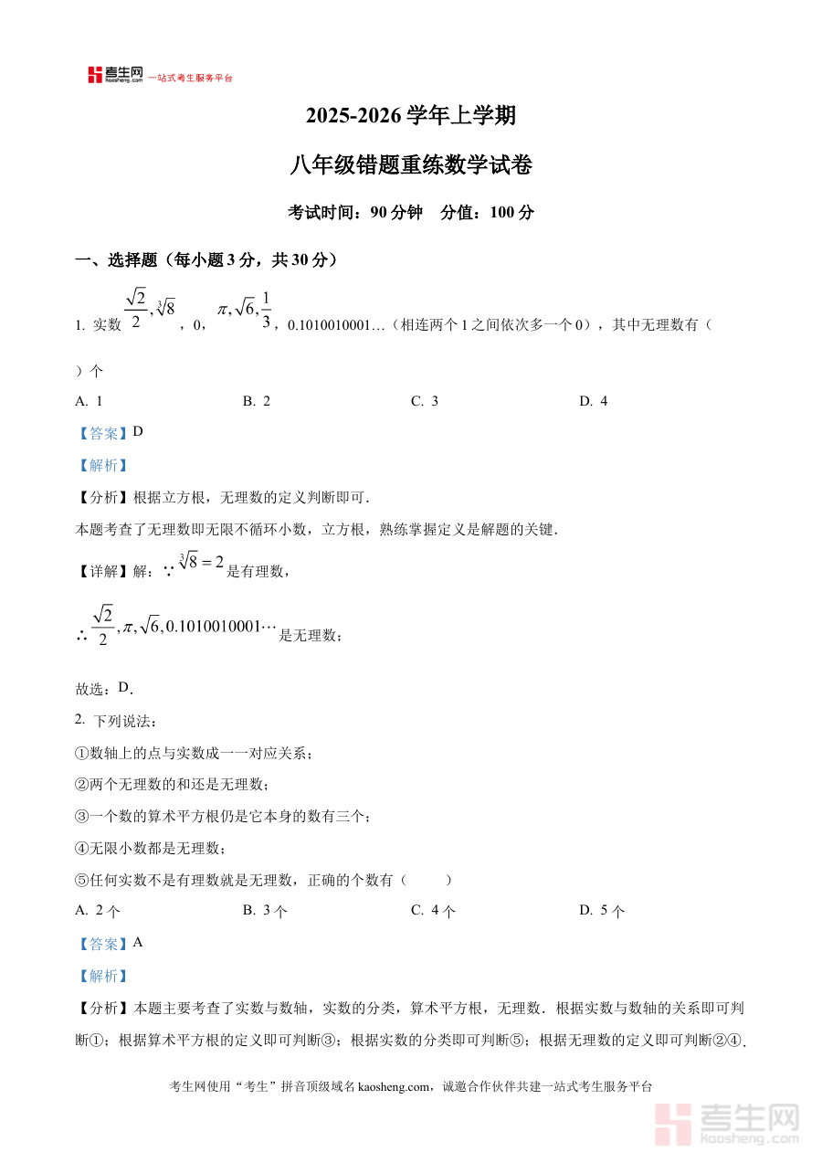 其适用人群主要包括河南省郑州实验外国语中学2025-2026学年八年级学生、该学段数学教师及关注学生阶段学习进展的家长,通过对月考卷的解析,能够强化阶段检测的反馈价值,提升备考规划的精准性,有效辅助提升阶段学习效果。
