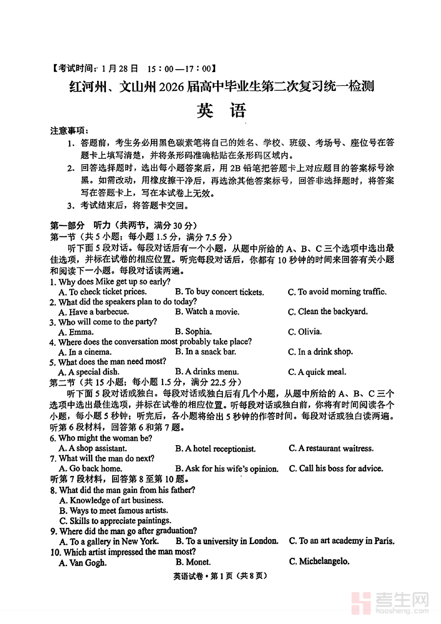 适用人群为红河州、文山州2026届高中毕业生及相关英语教师。考生通过参与该检测可模拟区域复习考查方向,提升阶段测试应对能力;教师借助检测结果能精准把握学生群体复习状况,优化备考规划,助力考生高效推进英语复习进程。