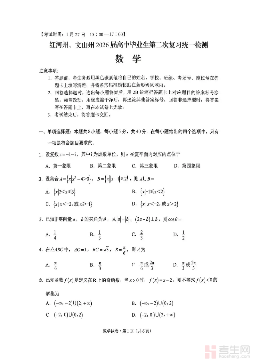 此资料适用于2026届红河州、文山州的高中毕业生、数学教师及相关教育管理工作者。对于学生而言,它是自我评估复习进度、明确提升方向的有效工具;对于教师,可通过检测结果把握班级及区域学生整体学习状况,调整教学重点与方法;对于教育管理者,该资料能为区域复习教学质量监控与提升提供数据支持,助力两地高中数学复习工作高效推进。