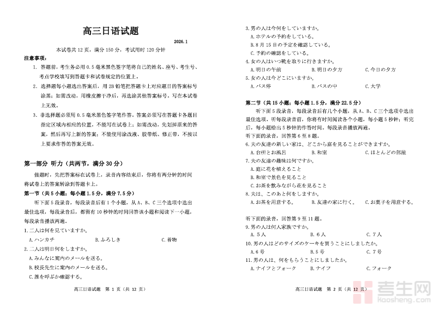 《日语-山东省德州市2025-2026学年度2026届高三年级上学期期末》是针对山东省德州市2025至2026学年度、面向2026届高三年级学生的日语学科上学期期末相关备考资料,其命题方向与当地高三日语教学进度及期末检测要求相契合,能够为学生提供贴合区域考试实际的练习依据。