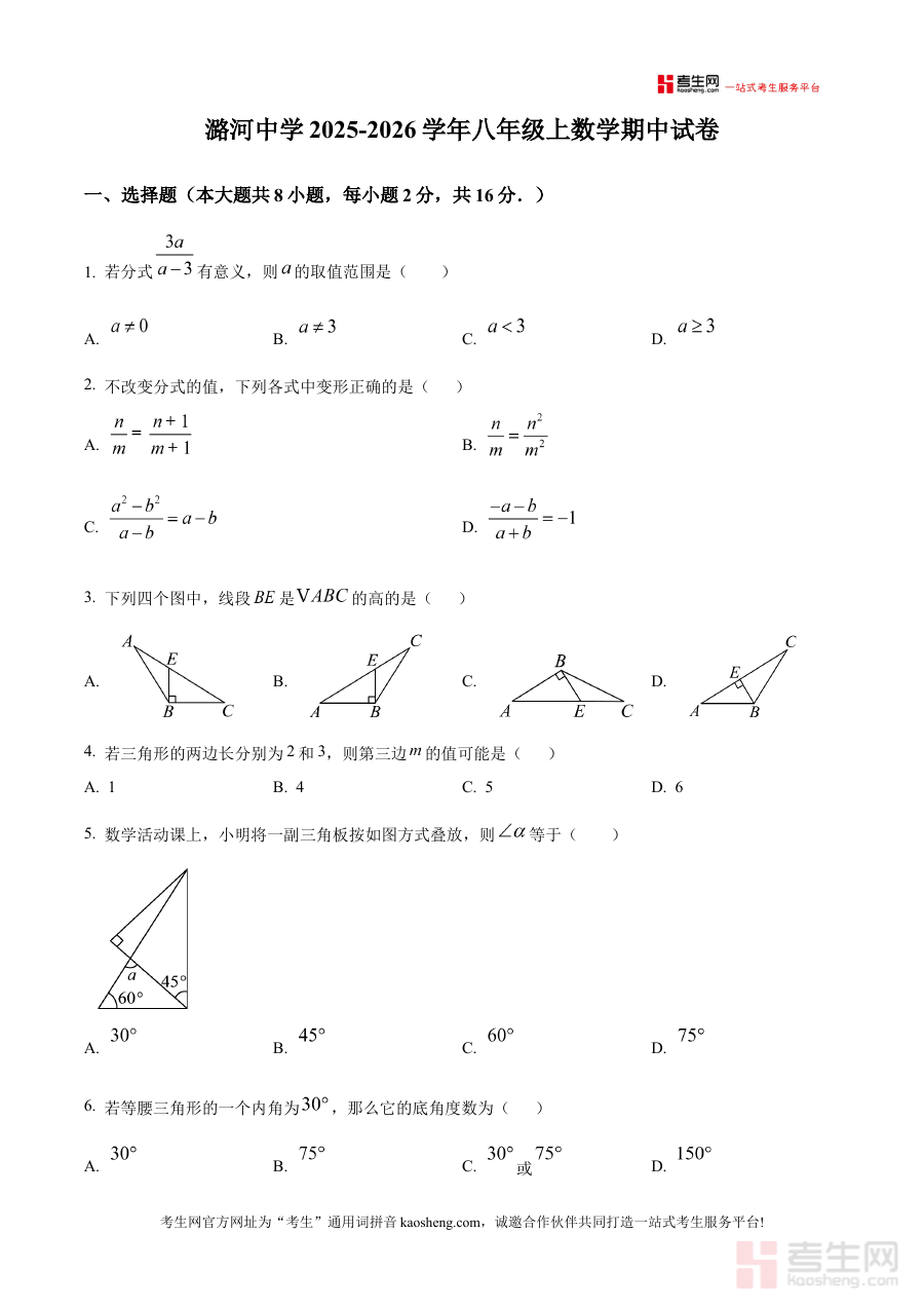 《精品解析:北京市通州区潞河中学2025-2026学年八年级上学期期中数学试卷(原卷版)》是针对北京市通州区潞河中学特定学年学期的期中数学考试所编制的原卷形式备考资料,其年份与学期定位明确,能够直接对应该阶段学生的数学学习进度与学校的期中考查需求,为使用者提供与实际考试场景高度匹配的练习材料。