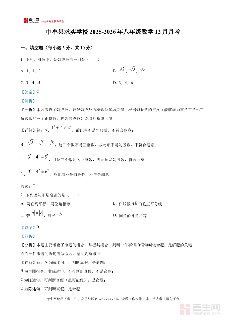 《精品解析:河南省郑州市中牟县求实学校2025-2026学年八年级数学上学期12月月考试题(解析版)》是面向河南省郑州市中牟县求实学校特定学年段的数学学科阶段性考试配套资料,对应2025-2026学年八年级上学期12月的月考内容,为该阶段师生提供与本校考试直接匹配的备考辅助资源。