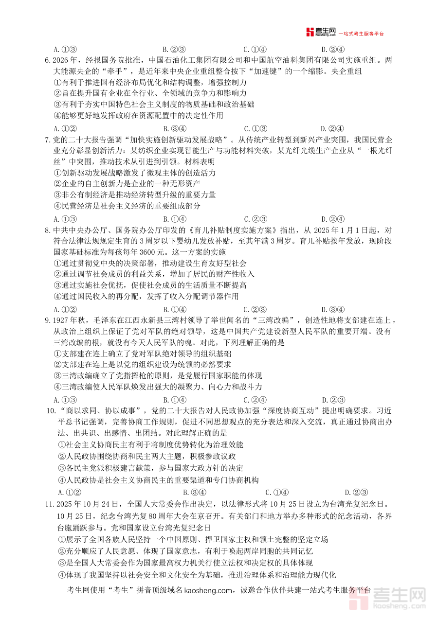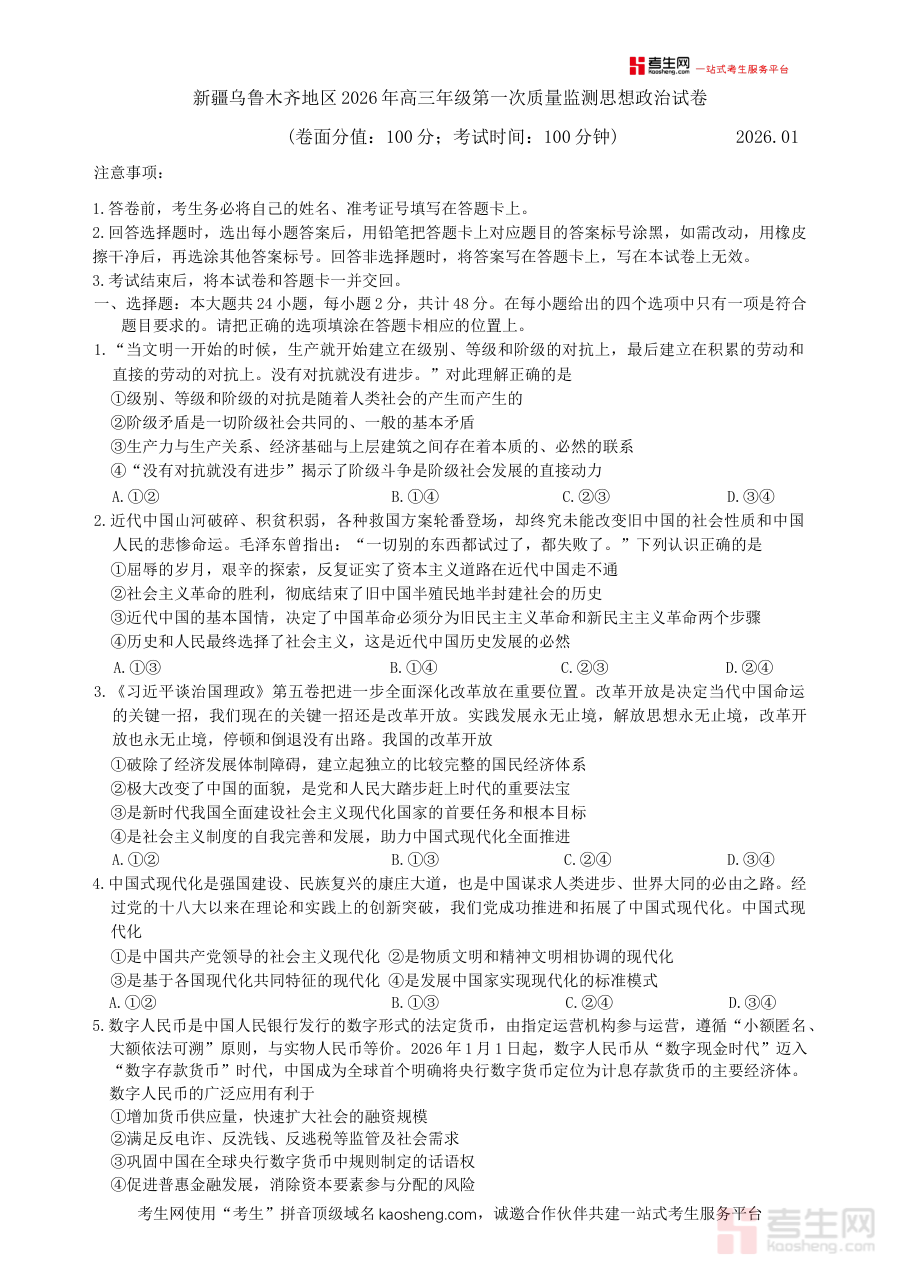 本资料适用于2026届新疆乌鲁木齐地区的高三学生、思想政治学科教师及相关教育教研人员。对于学生而言,完成这份试卷能让他们提前熟悉区域质量监测的考查形式与要求,积累应试经验;对于教师和教研人员来说,这份资料是开展阶段教学评估、制定科学备考方案的重要支撑,有助于提升高三思想政治学科教学质量和学生备考效率。