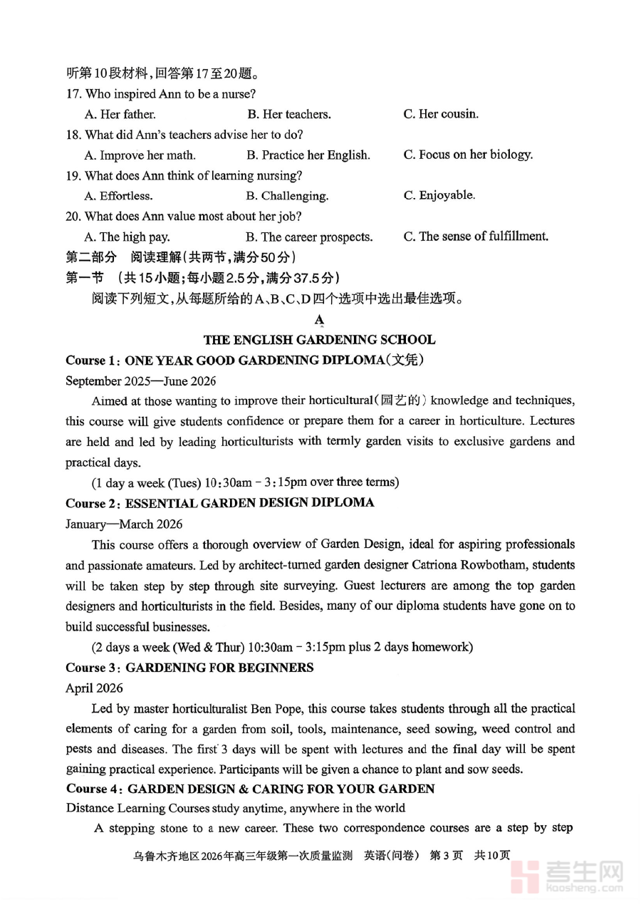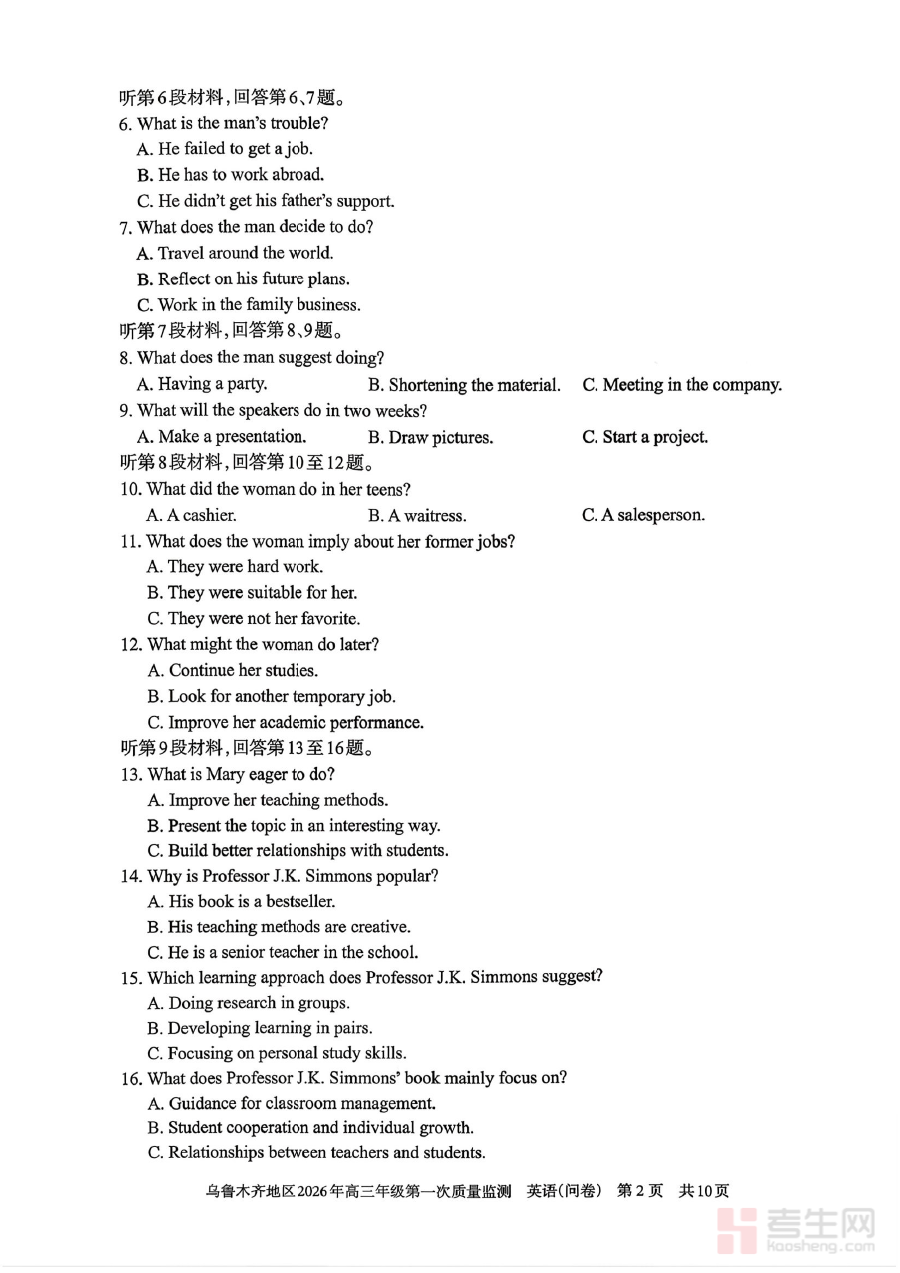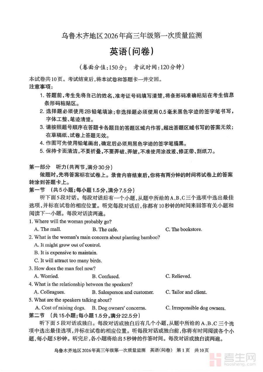 该资料主要适用于2026届新疆乌鲁木齐地区的高三学生、英语学科教师及相关教育工作者。对于学生而言,完成试卷并结合答案复盘能直观反映阶段学习成果,助力针对性提升;对于教师来说,借助该资料开展阶段性评估可优化教学方案;对于教育工作者而言,它也能作为研究本地高三英语阶段教学情况的参考素材,共同推动高效备考进程与教学质量提升。