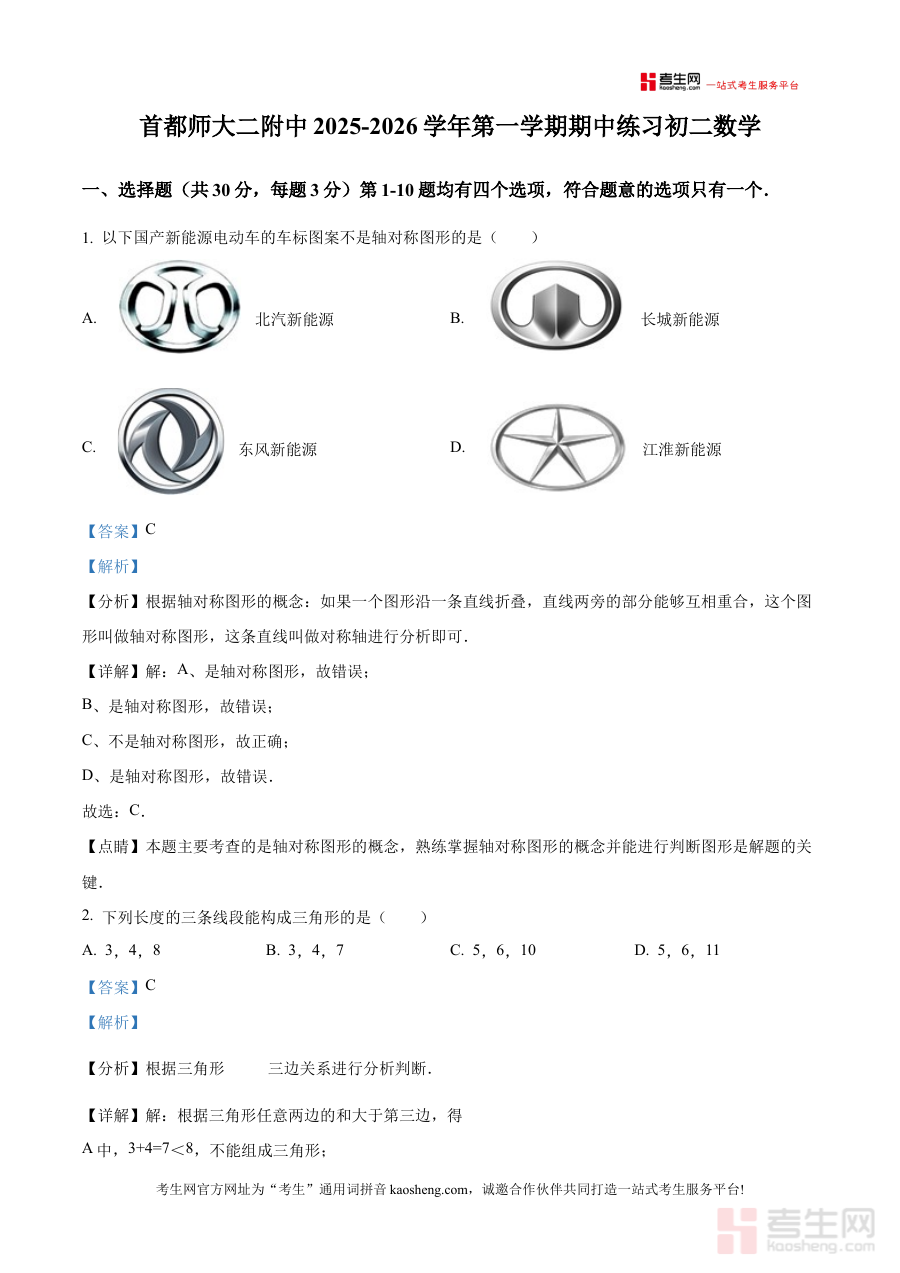 《精品解析:北京市首都师范大学第二附属中学2025-2026学年上学期八年级期中数学试题(解析版)》是针对北京市首都师范大学第二附属中学2025-2026学年上学期八年级期中数学考试的配套备考资料,聚焦该阶段数学学科的期中测试场景,为使用者提供与学校期中考查方向匹配的解析内容。