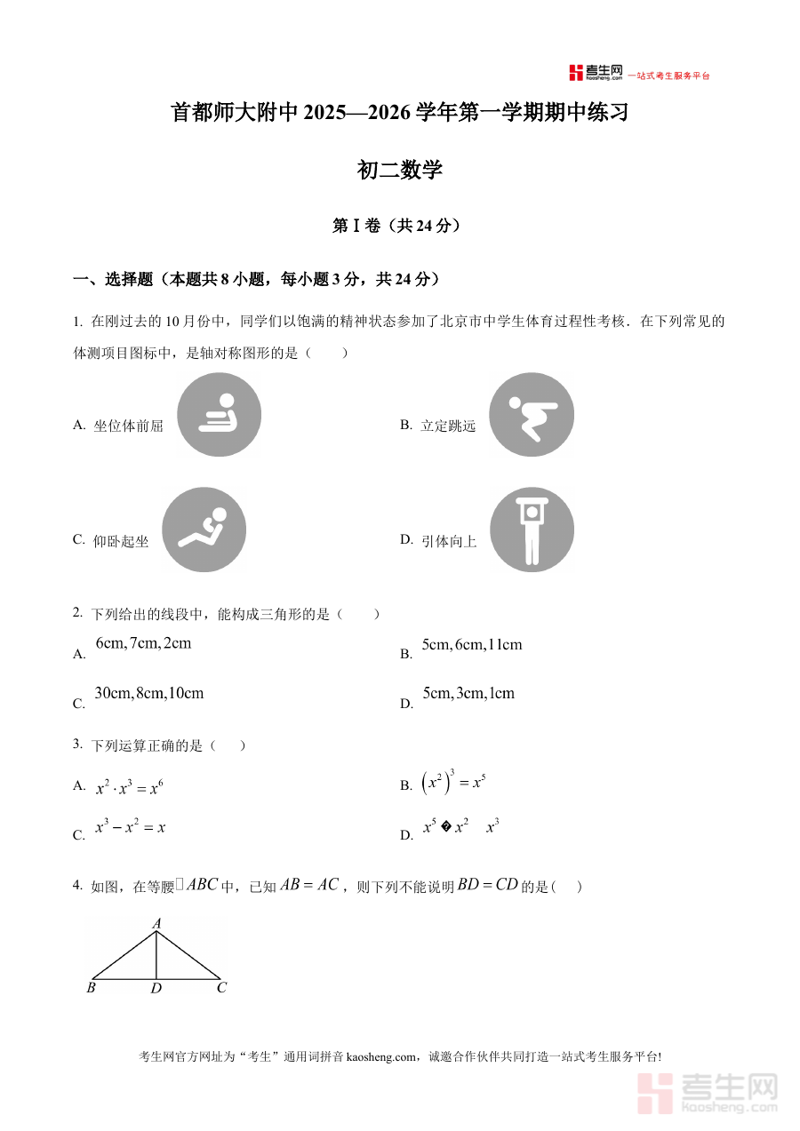 《精品解析:北京市首都师范大学附属中学2025-2026学年上学期八年级数学期中试卷(原卷版)》是北京市首都师范大学附属中学在2025-2026学年上学期针对八年级学生数学学科期中阶段设计的考试资料,为该阶段学生的数学备考提供了贴合校情的权威参考载体。
