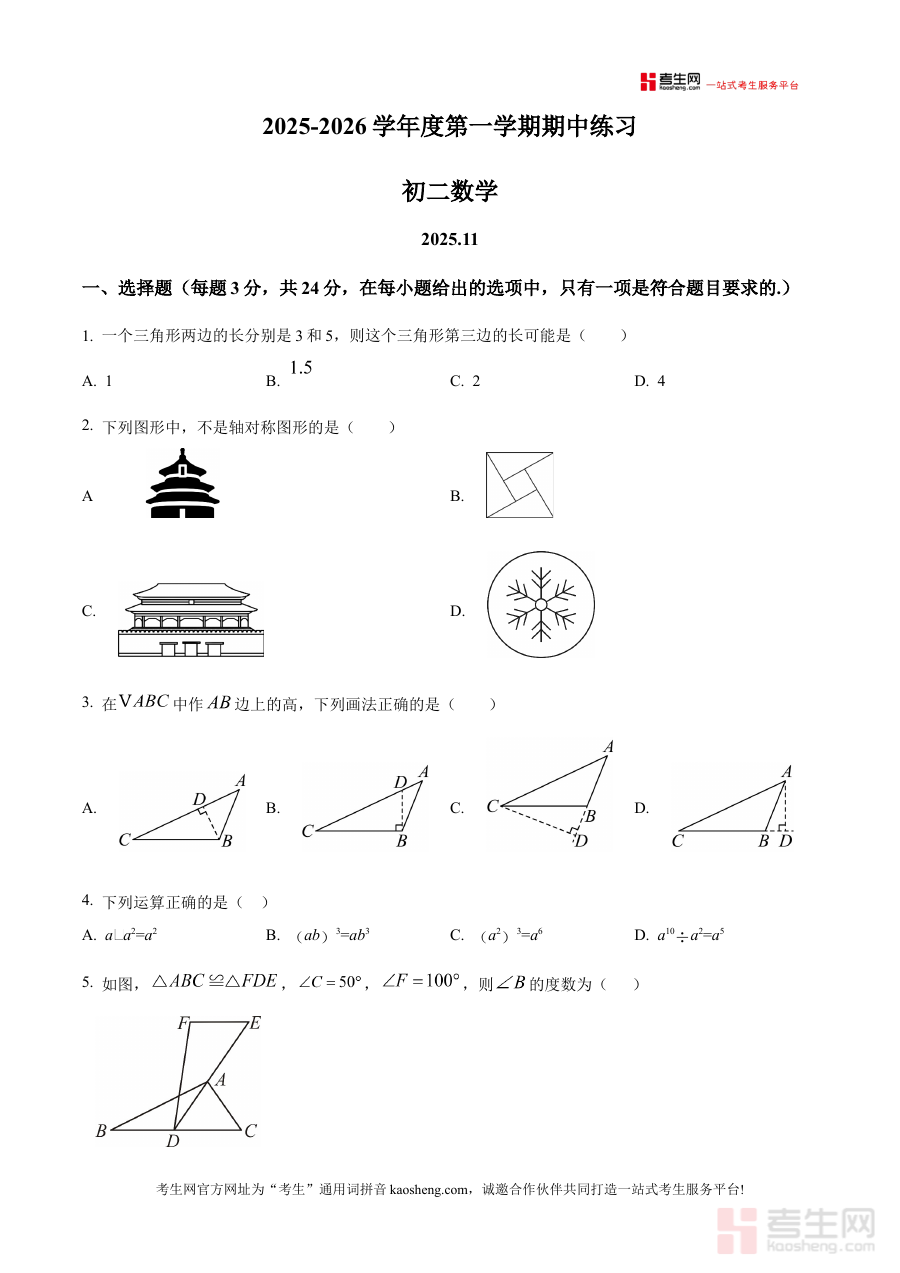 本资料主要适用于北京师范大学第三附属中学2025-2026学年八年级学生,同时也为该学段的数学教师提供教学参考依据,为家长了解孩子学习状况提供支持,其原卷形式能有效还原考试场景,对提升学生期中备考效率和阶段学习质量具有重要价值。
