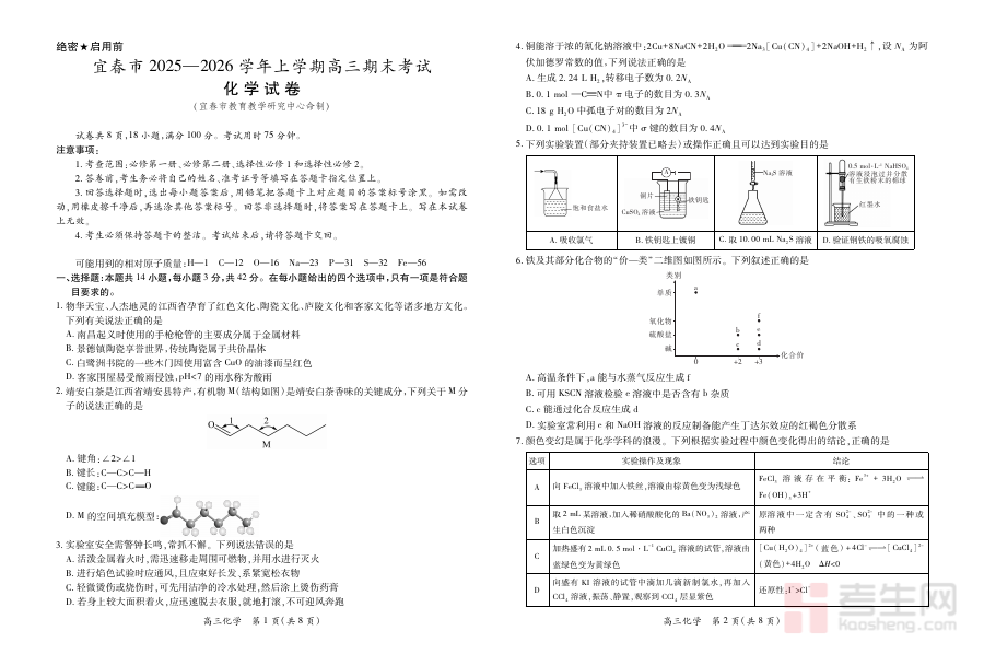 《江西省宜春市2025-2026学年上学期高三期末考试 化学》是针对江西省宜春市区域内2025-2026学年高三年级上学期期末阶段化学学科的专项备考资料。该资料紧密贴合当地高三化学教学进度与期末检测要求,能够为师生提供与区域考试标准相匹配的复习参考方向,帮助使用者提前熟悉该阶段化学考试的整体框架与考查范围,具有较强的地域针对性和阶段适配性。