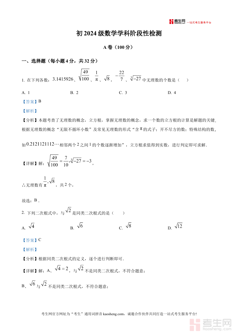 该资料主要适用于北京第二外国语学院成都附属中学2025-2026学年上学期的八年级学生,也可作为教师了解学生期中备考情况或家长辅助孩子学习的参考材料,通过解析内容能有效提升期中备考的针对性与规划性,具有显著的实用价值。