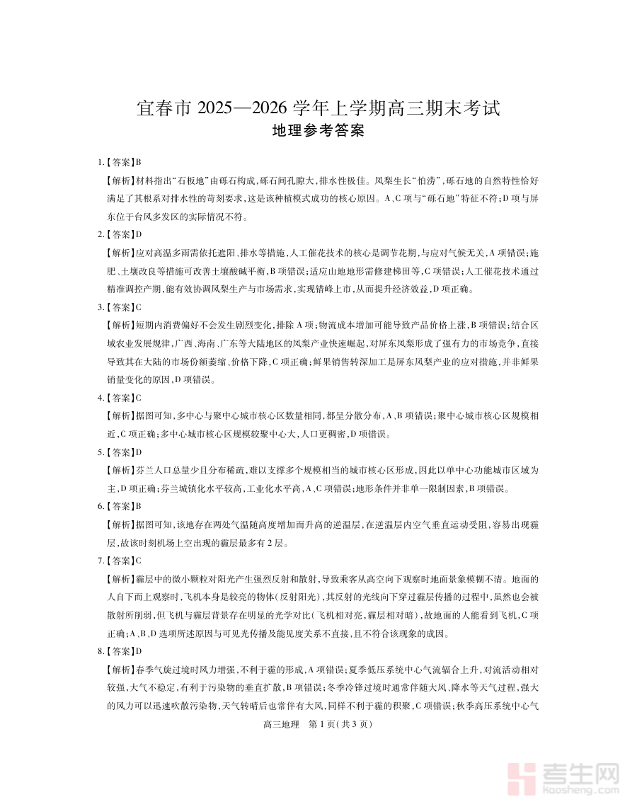 《江西省宜春市2025-2026学年上学期高三期末考试 地理答案》是针对江西省宜春市2025至2026学年第一学期高三年级地理期末考试的配套答案资料,属于区域性高三阶段学业水平检测的辅助材料,能够为相关考试的结果验证提供直接依据。