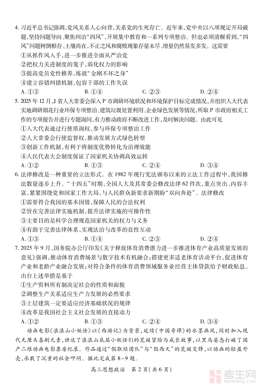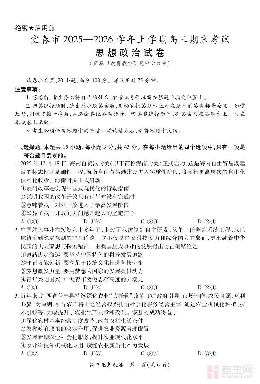 《江西省宜春市2025-2026学年上学期高三期末考试 思想政治》是面向江西省宜春市2025至2026学年第一学期高三年级学生的思想政治学科期末考试配套备考资料。该资料紧扣当地高三上学期期末这一重要学习节点,围绕思想政治学科的阶段性学习目标与考查需求设计,为使用者提供与本次考试直接相关的备考辅助,帮助其把握考试的阶段定位与整体方向。