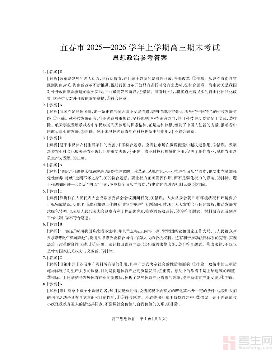 《江西省宜春市2025-2026学年上学期高三期末考试 思想政治答案》是针对江西省宜春市2025至2026学年第一学期高三思想政治期末考试的配套参考答案资料,该考试属于区域内高三阶段的重要终结性评价测试,旨在对高三学生上学期思想政治学科的学习成果进行系统性检验。