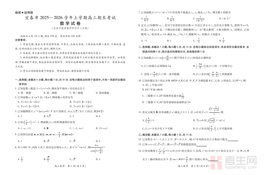 《江西省宜春市2025-2026学年上学期高三期末考试 数学》是针对江西省宜春市区域内高三学生在2025-2026学年上学期期末阶段设置的数学学科考试相关资料,属于高三学年关键节点的阶段性考试配套材料,能够为学生和教师提供该学期数学学习成果的参考依据,是贴合当地教学进度与考试标准的专业备考资源。