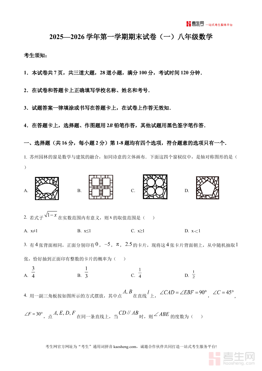适用于北京市延庆区2025-2026学年上学期的八年级学生、数学教师及学生家长。对学生而言,它能助力期末备考的针对性提升;对教师和家长来说,可借助其把握本地期末考的命题方向,辅助制定教学或辅导方案,具有显著的实用价值。