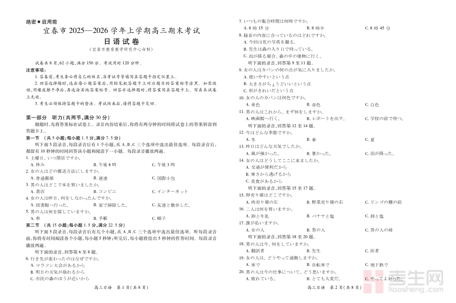 其适用人群主要为江西省宜春市2025-2026学年上学期的高三日语学生及相关任课教师。对于学生而言,它是自我检测学习效果、查漏补缺的重要工具;对于教师而言,则可作为了解班级整体学习状况、调整教学策略的参考依据,共同推动日语学科的高效复习与备考,为期末考试取得良好成绩奠定基础。