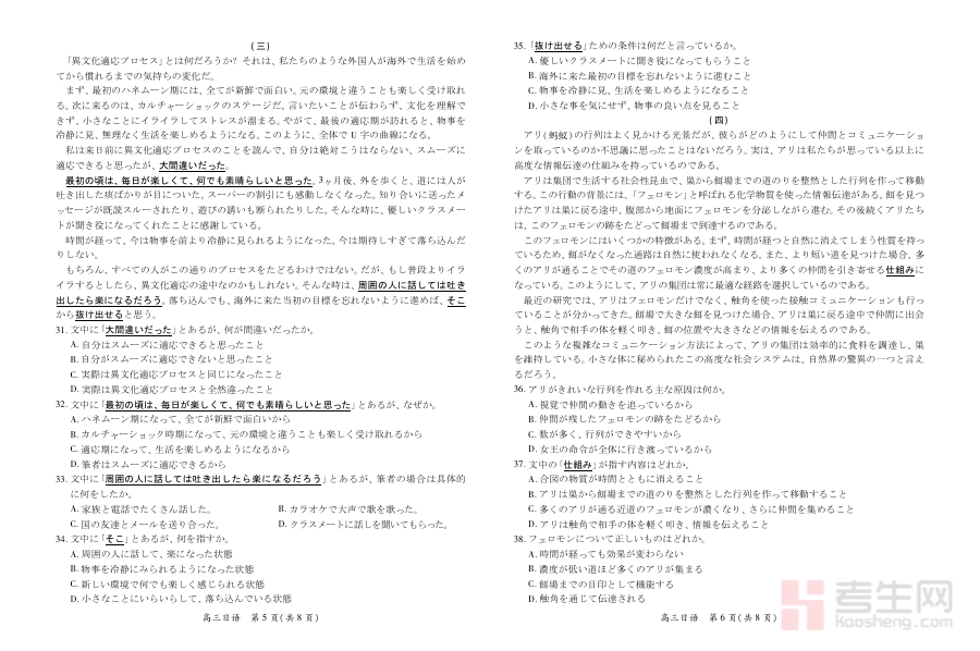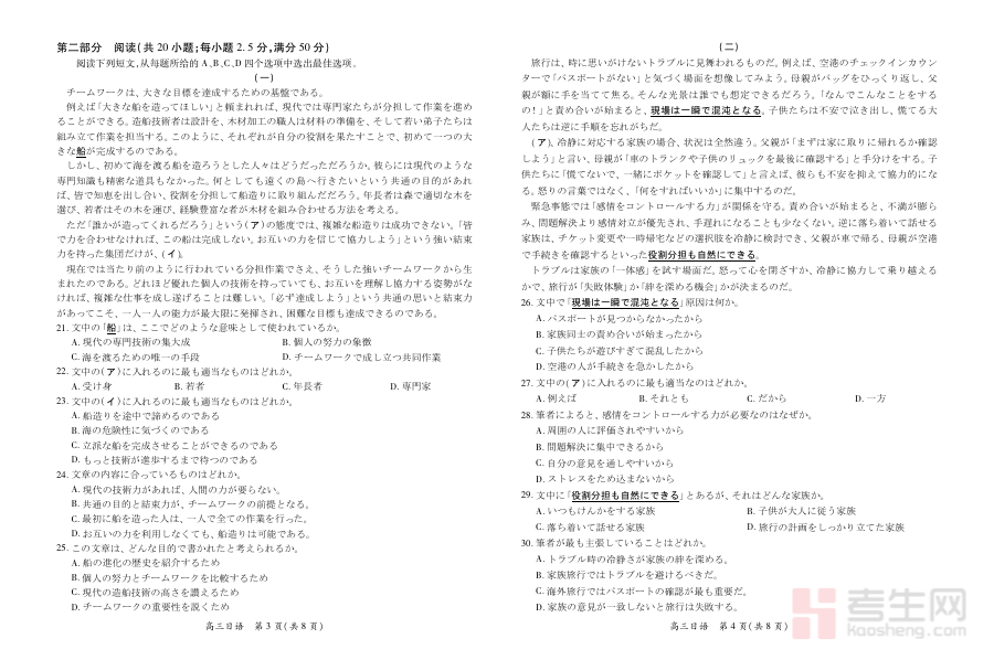 该资料可用于高三日语学习者的学情诊断与阶段检测,帮助学生精准识别自身在日语知识体系构建、语言应用能力等方面的薄弱环节;同时,也能为教师和学生制定个性化备考规划提供支撑,通过对阶段性学习成果的分析,优化复习重点与方法,确保备考过程更具针对性和有效性。