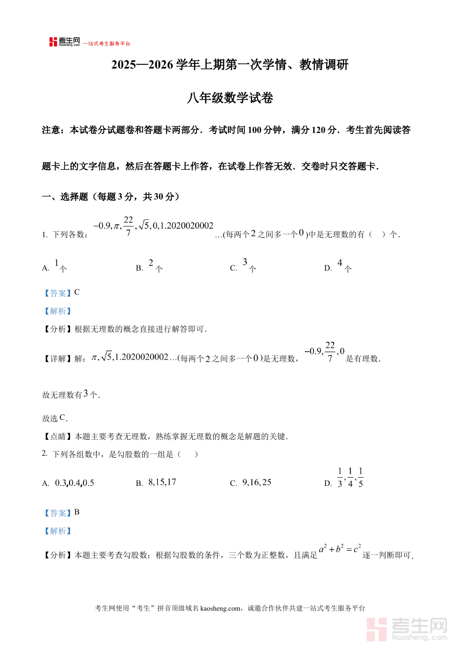 本资料核心适用人群为河南省郑州市高新区一中2025-2026学年上学期的八年级学生,也适合该校数学教师用于教学评估与指导;其解析版形式能帮助使用者深入理解试题知识逻辑与解题思路,提升阶段检测有效性及备考规划精准性,对巩固该阶段数学学习成果、增强考试应对能力具有重要实用价值。