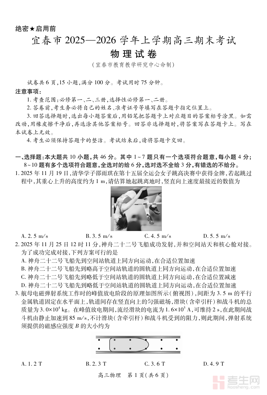 《江西省宜春市2025-2026学年上学期高三期末考试 物理》是江西省宜春市教育系统针对2025-2026学年上学期高三年级学生组织的物理学科期末考试相关备考资料。该资料对应高三上学期末期的重要检测节点,明确体现了宜春市该阶段物理学科的考试范围和评价方向,为使用者提供了贴合当地教学实际的备考参考依据,帮助使用者快速把握区域内物理考试的核心导向。