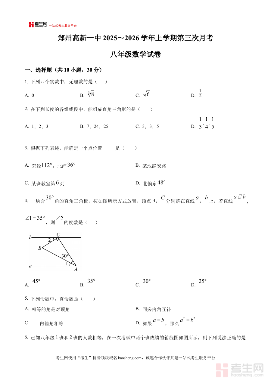 《精品解析:河南省郑州市高新区第一中学2025-2026学年上学期八年级第三次月考数学试卷(原卷版)》是针对河南省郑州市高新区第一中学2025-2026学年上学期八年级第三次月考数学科目的备考资料,聚焦该阶段学校组织的数学阶段性考试需求,为相关师生提供与本校考试直接匹配的原卷资源。