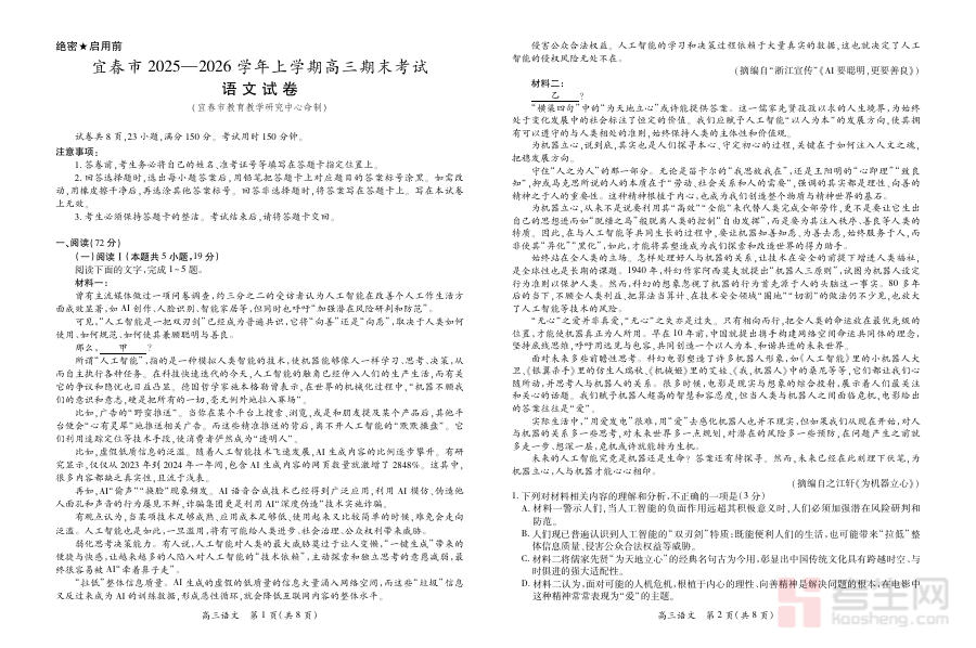 该资料主要适用于江西省宜春市2025-2026学年上学期的高三学生、语文教师及相关教育工作者。对学生而言,通过模拟检测可提前熟悉期末考试考查形式与节奏;对教师而言,可借助其了解学生整体学习状况以优化教学策略;整体上,其在高三上学期期末阶段的学情诊断与备考规划中具有重要参考价值。