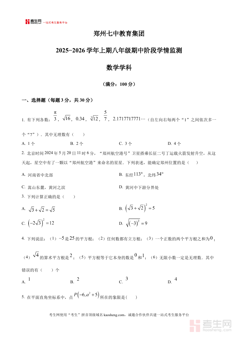 《精品解析:河南省郑州七中教育集团2025-2026学年八年级上学期期中数学试卷(原卷版)》是针对河南省郑州七中教育集团范围内2025-2026学年八年级学生上学期期中数学考试的配套备考资料。该资料依托集团内期中检测的标准要求编制,能够精准反映该阶段数学学科的阶段性考查方向与集团教学的核心重点,为学生提供贴合实际考试场景的练习载体。
